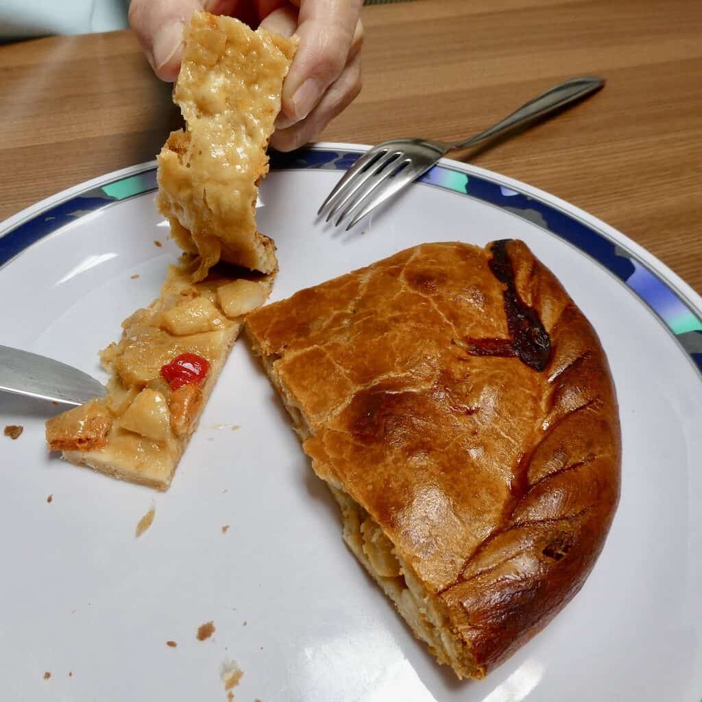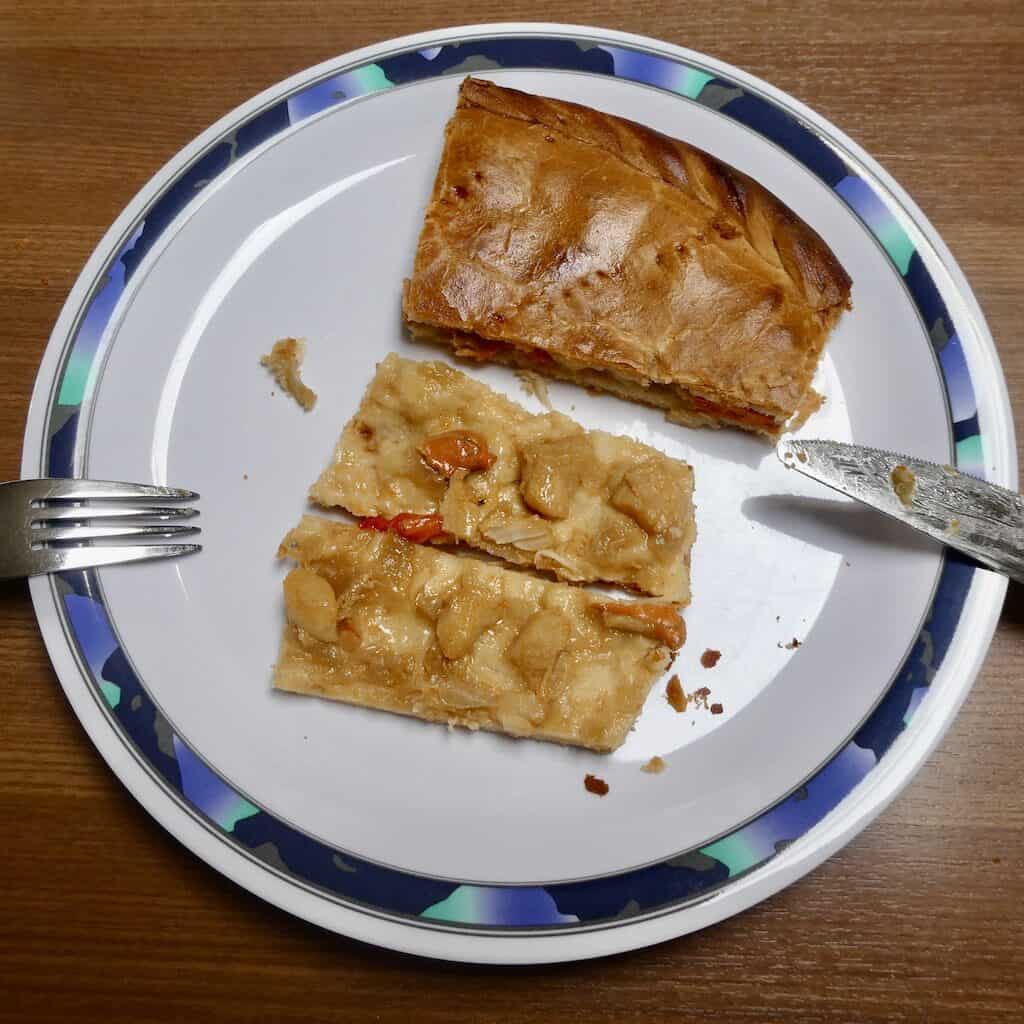 Beim Verspeisen im Mobi stellt sich dies als eine Thunfisch-Pastete heraus, bestehend hauptsächlich aus Mehl, Eiern, Salz, Fisch und Gewürzen. Wir würden dies nicht noch einmal kaufen, zumal wir eher eine Nusstortenfüllung erwartet haben.