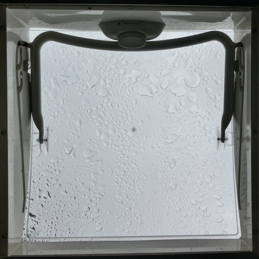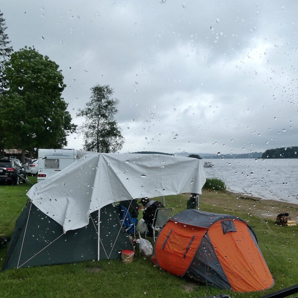 Morgens regnet es noch immer. Das Wasser auf unserer Dachluke ist weniger trostlos als der Anblick auf Nachbars Zelt-Improvisation.