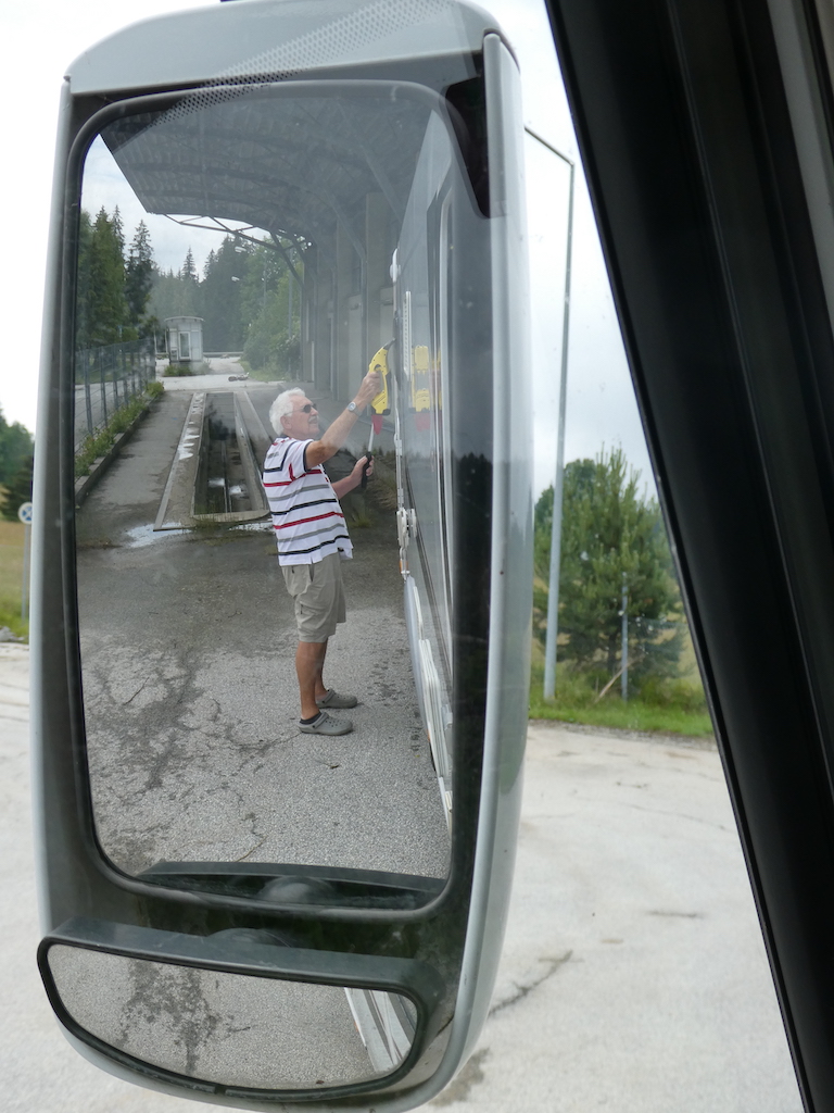 Unsere Mittagspause halten wir auf einem Parkplatz der ehemaligen Zollabfertigung. Die Scheiben brauchen trotz des gestrigen Regens wieder einmal eine gründliche Reinigung.