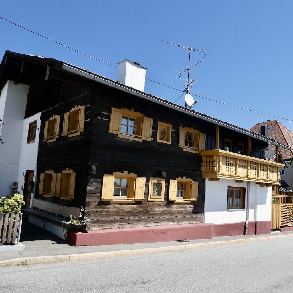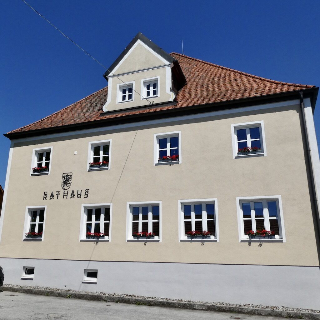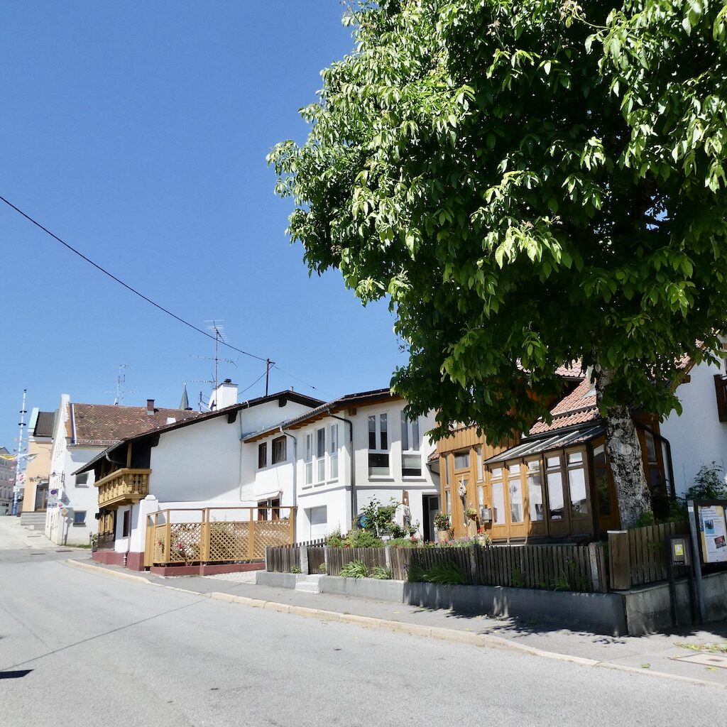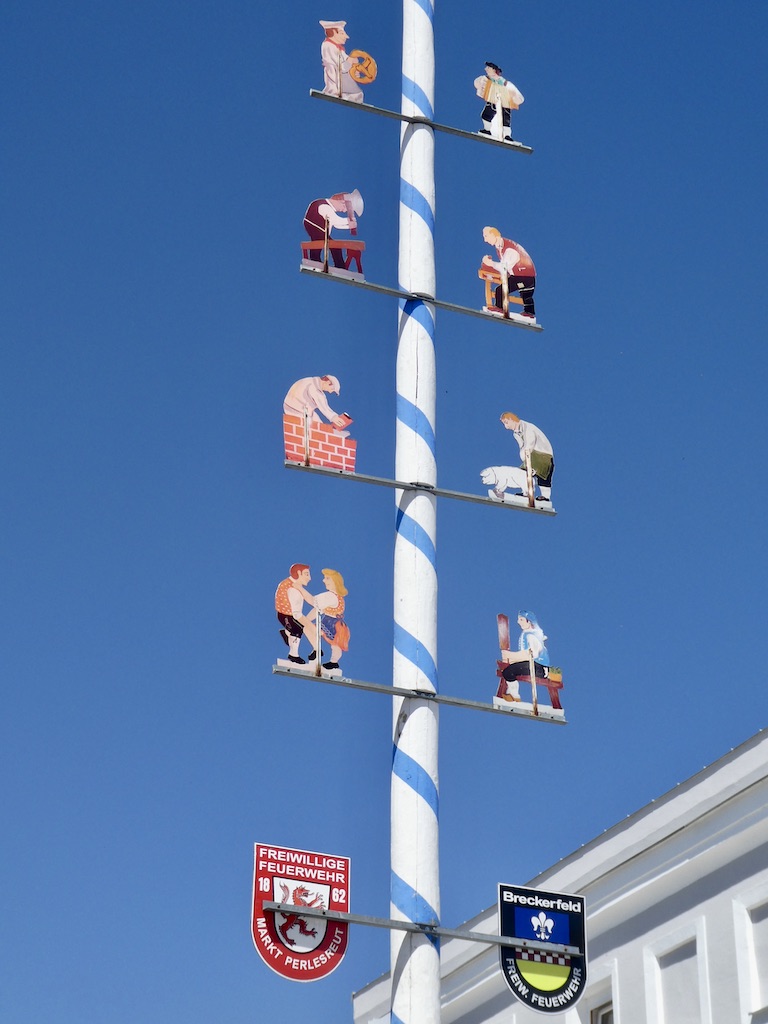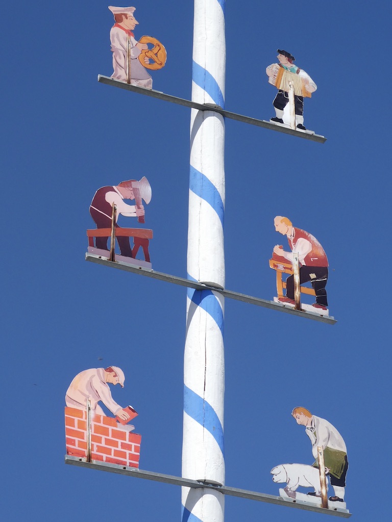Der Maibaum ist nach bayerischer Tradition ein spiralförmig bemalter Stamm, an dem verschiedene Zunftwappen aufgehängt sind.