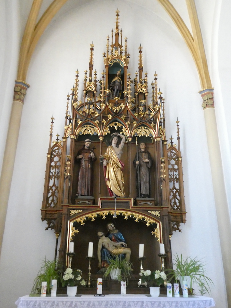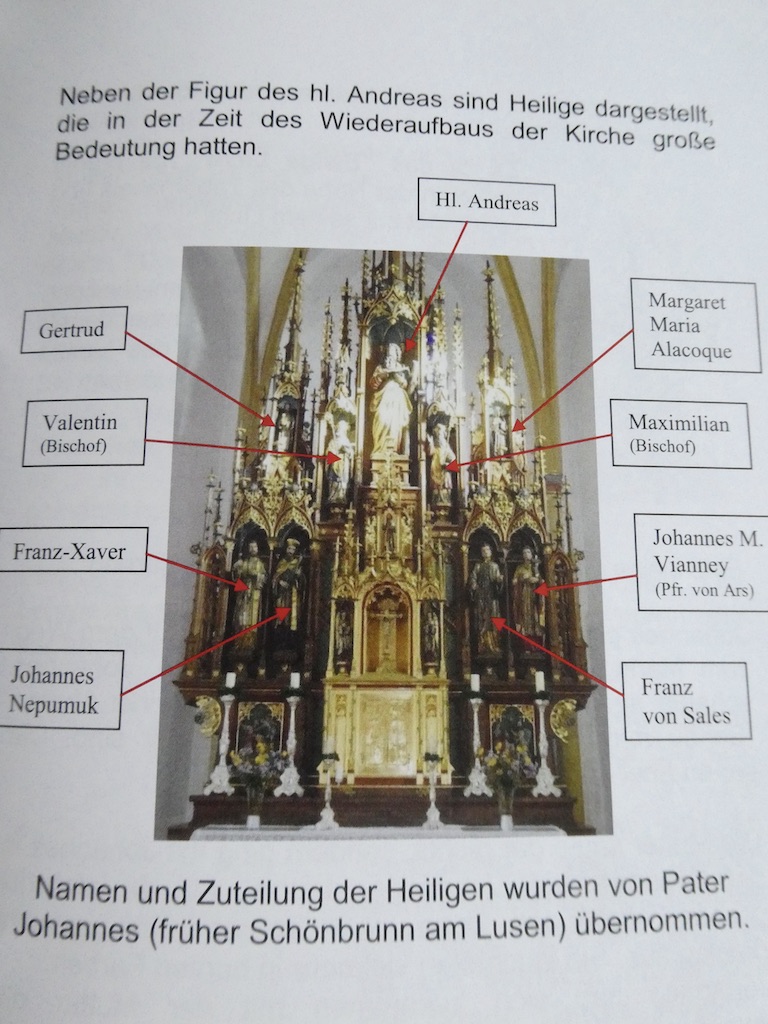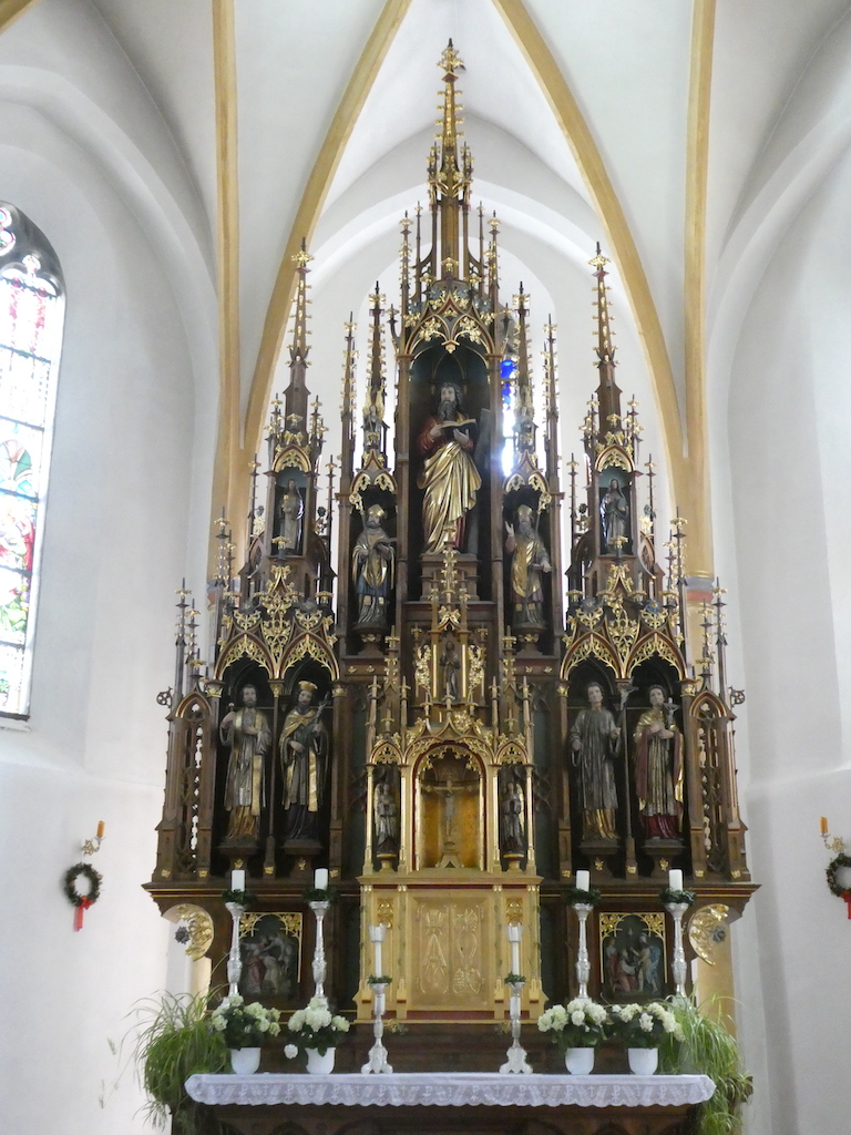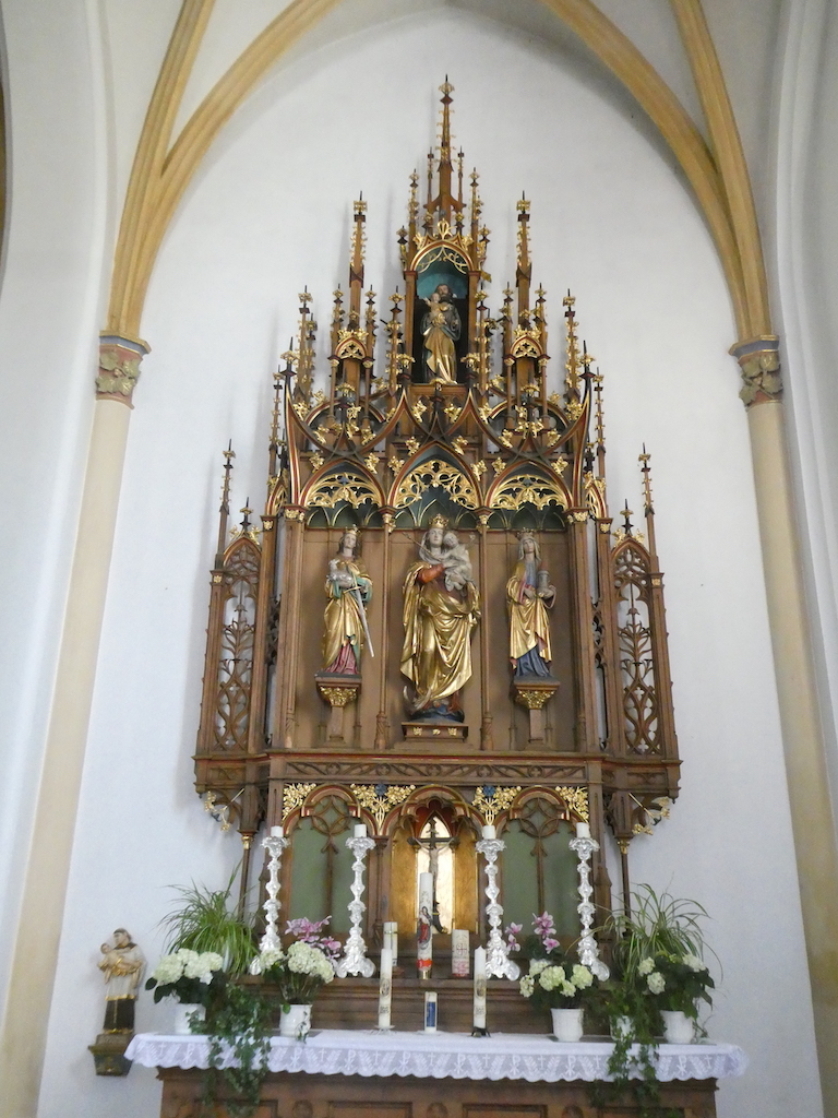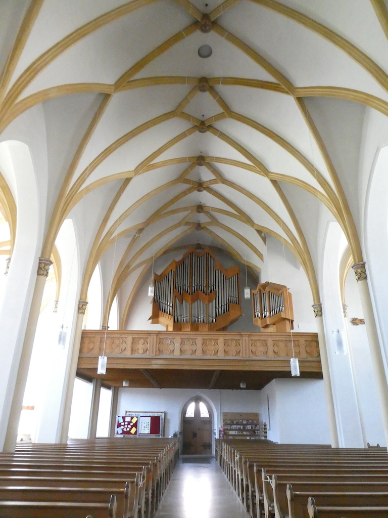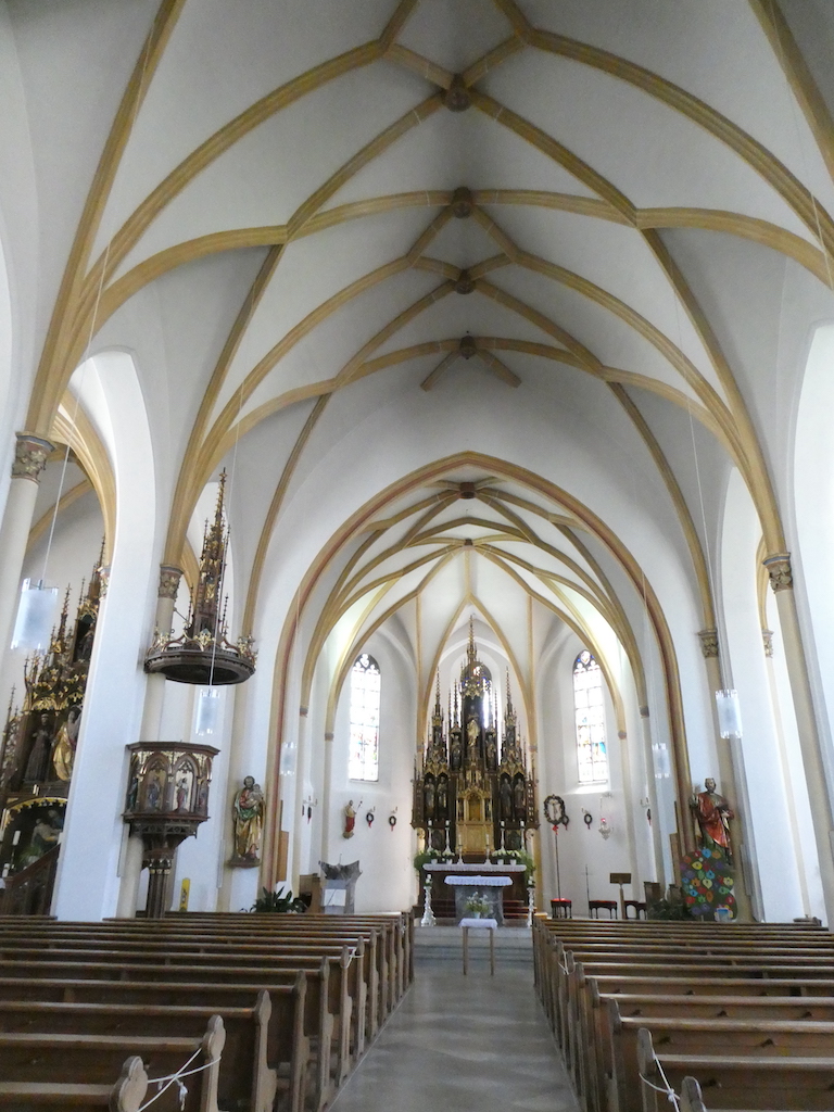 Die Pfarrkirche «St.Andreas», eine dreischiffige Stufenhalle, hat 450 Sitzplätze, – recht stattlich für die Gemeinde mit 3’000 Seelen.