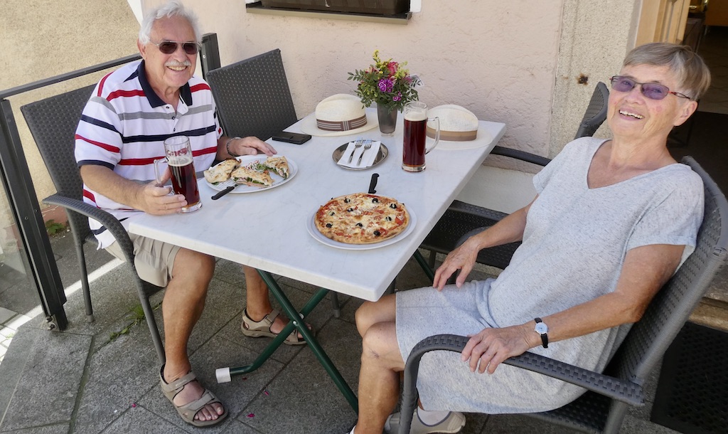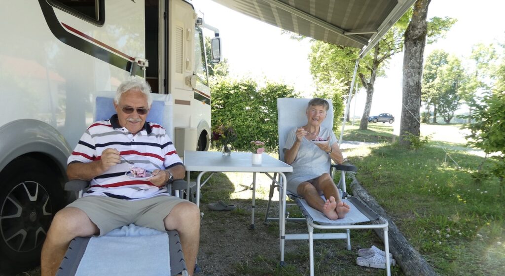 Zurück beim Mobi zaubert Renate noch ein Dessert aus dem Tiefkühlfach. Den Rest des Tages bewegten wir uns nur noch dem Schatten folgend. Wir hatten auch interessante Gespräche mit Carmen und Werner, einem Paar aus Tübingen, die auch mit dem Camper hier stehen.