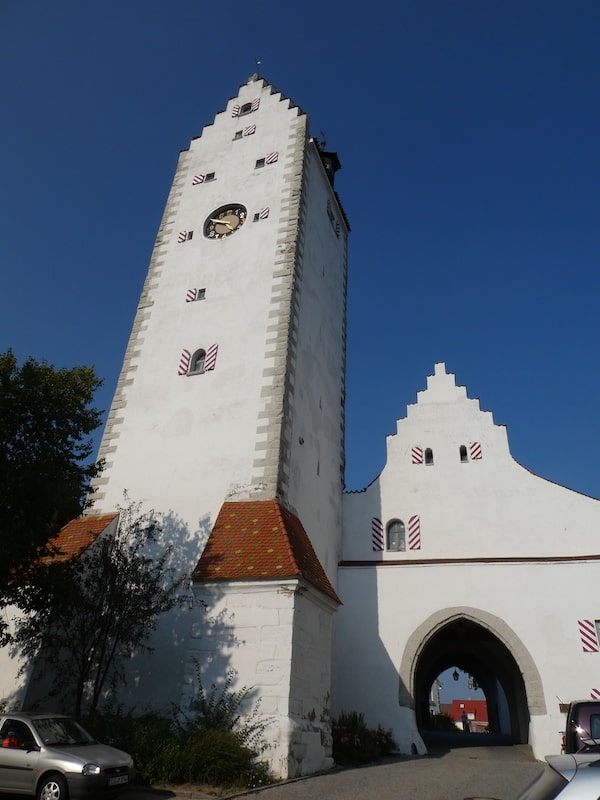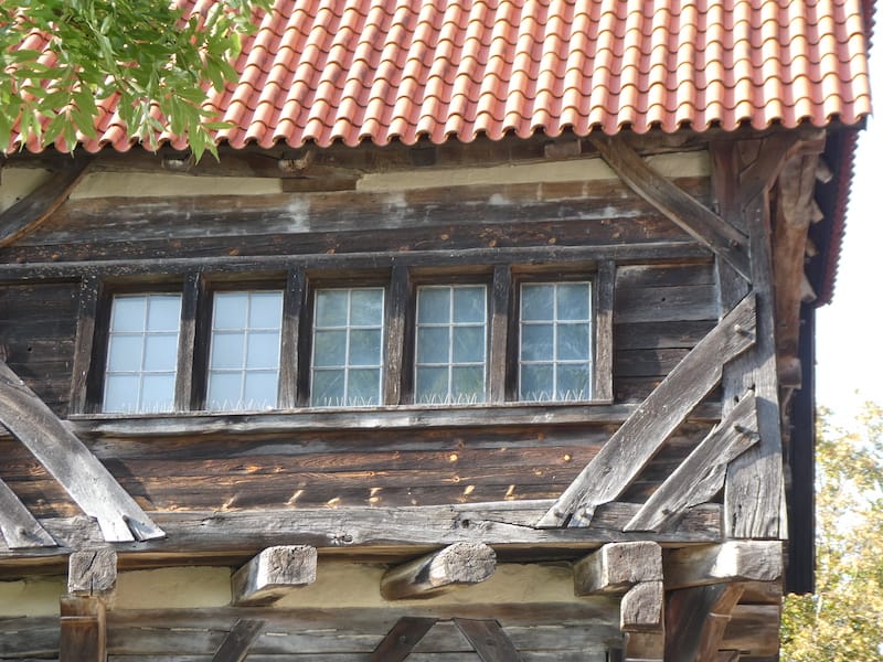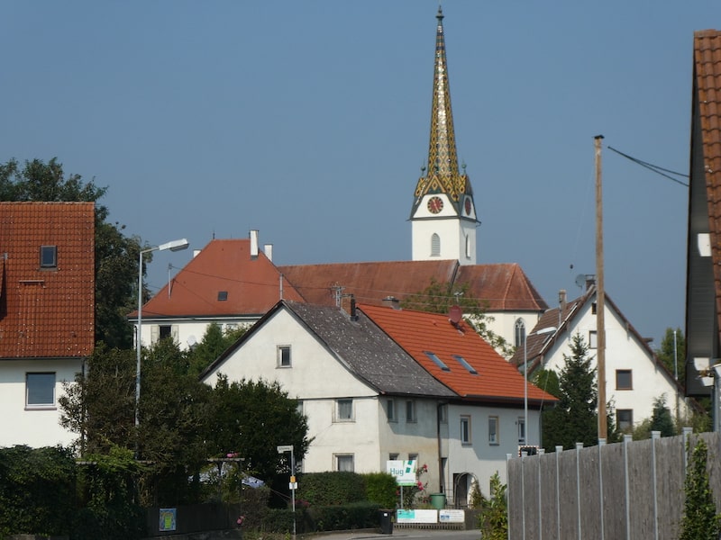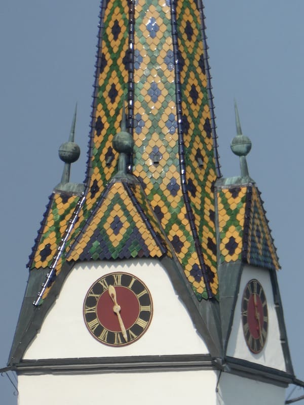 Die Kirchturmspitzen haben hier meistens schöne farbige Dachziegeln