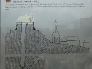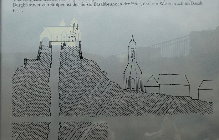 Interessant ist auch der Brunnen: Vier Bergleute arbeiteten sich 24 Jahre lang 84 Meter in die Tiefe. So entstand der tiefste Basaltbrunnen der Erde, der sein Wasser auch im Basalt fasst.