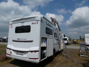 Bevor wir weiterfuhren, hatte Michael mit einem Mitarbeiter von Crystop, dem Hersteller unserer Satellitenanlage, telefoniert. So erfuhr er, dass er zur Reparatur einen 13er Gabelschlüssel und eine Leiter brauchen würde. Beides haben wir nicht dabei.