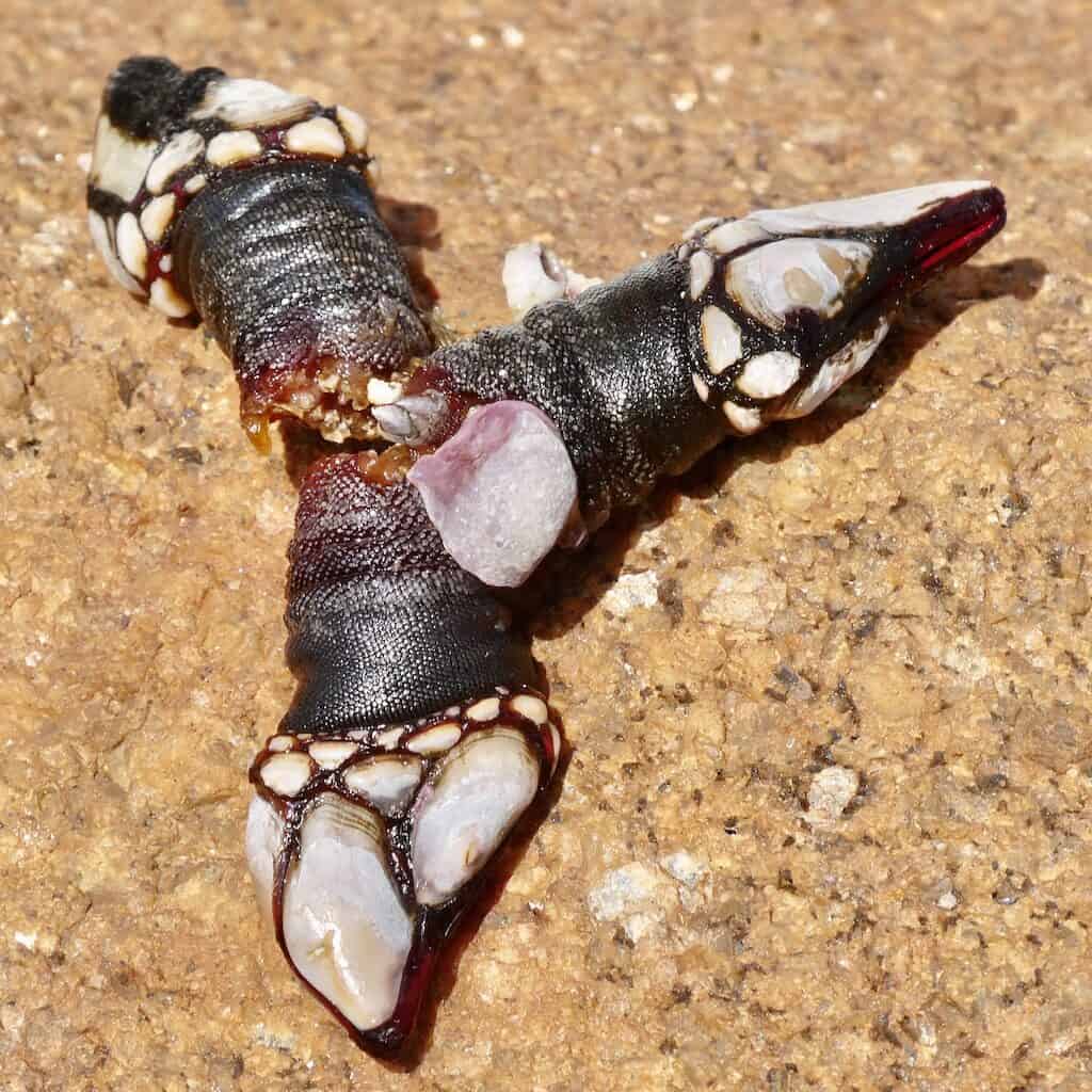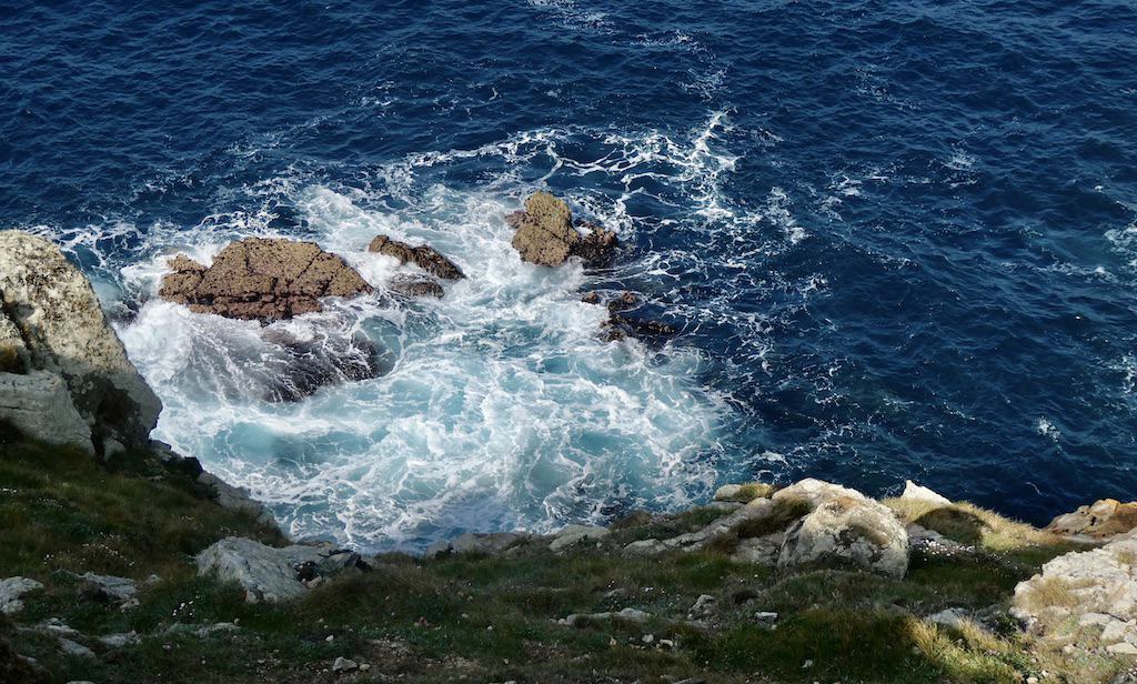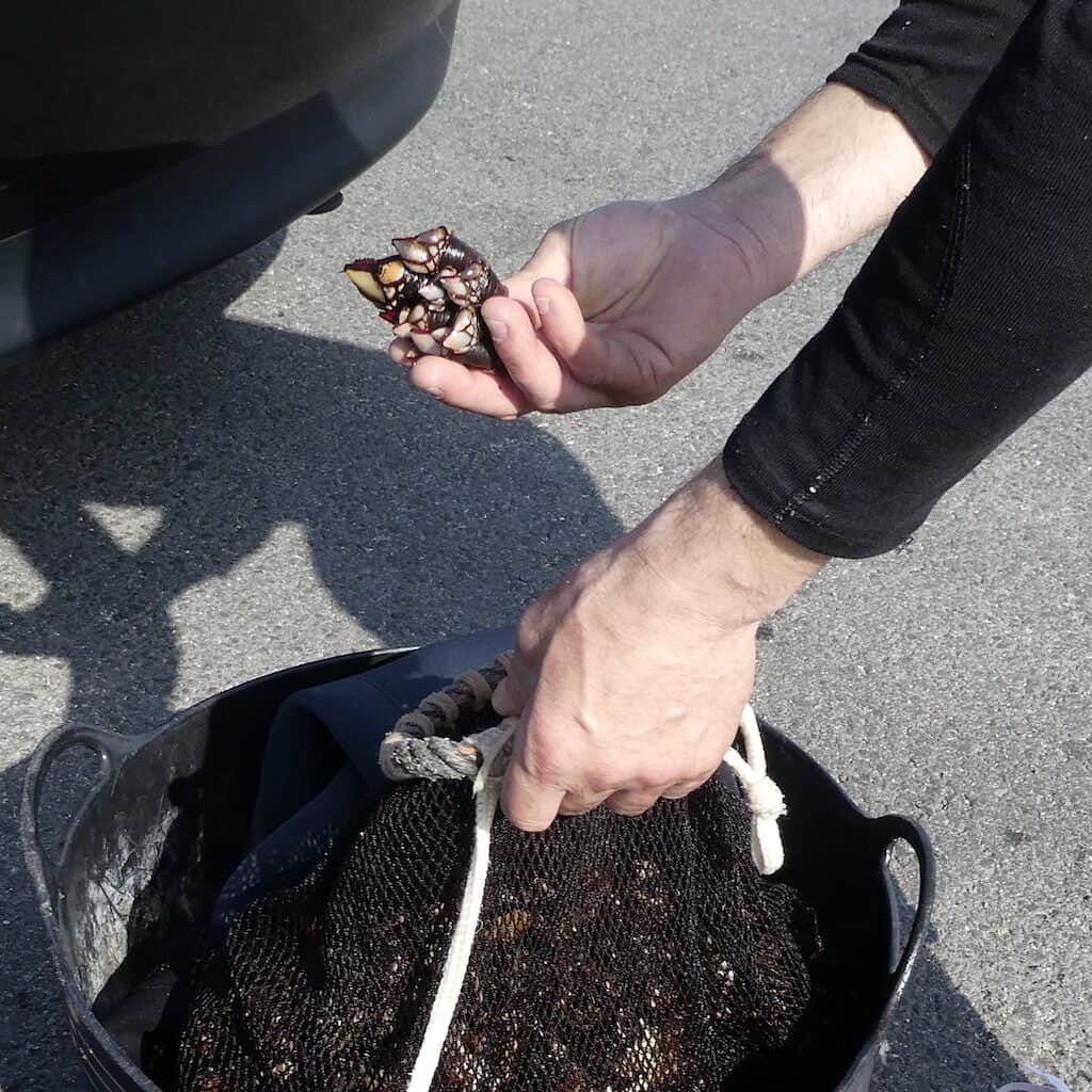 Wir treffen zwei Spanier, die in Neopren-Anzügen Meeresfrüchte von den Felsen gesammelt haben. Es sind Seepocken, offenbar eine Delikatesse. Wir erhalten einige zum Verkosten, aber wir können diese ledrige Haut nicht einmal öffnen, geschweige denn essen.