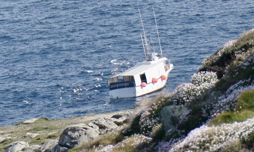 Die Brandung trifft hier von Amerika kommend zum ersten Mal auf Spanien. Ein Fischerboot geigt recht heftig in den Wellen.