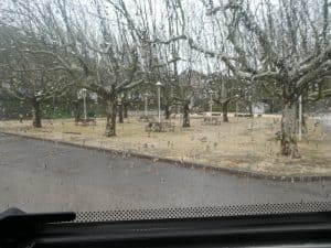 Bei weitem das Schönste an diesem Ort ist der Boule-Platz, bei dem wir stehen. Da tummelt sich heute, bei diesem Wetter aber niemand.