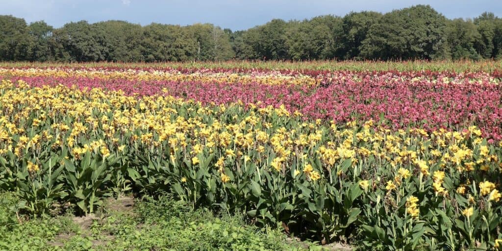 Heute scheint die Sonne auf das grosse Blumenfeld auf dem Weg zum Stellplatz. Offenbar ist dies «Indisches Blumenrohr» der Gattung Canna.