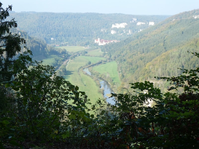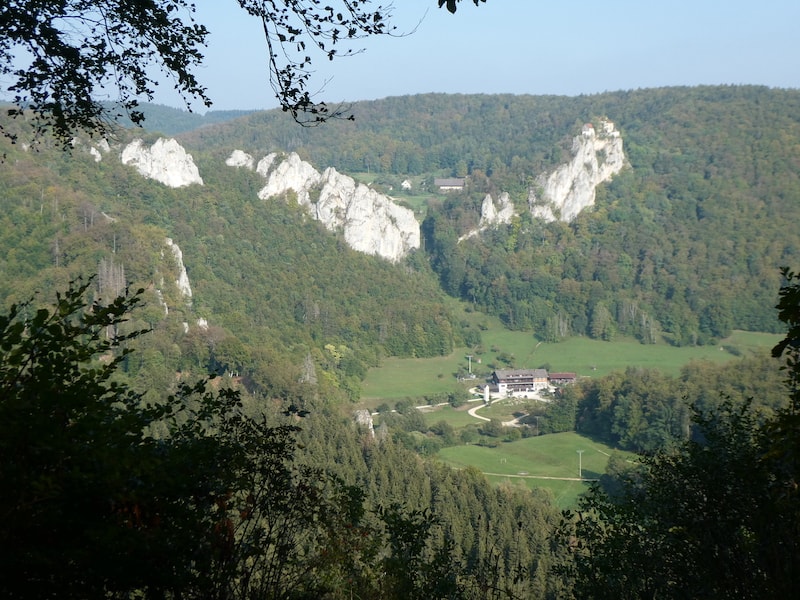Nach Beuron führt die Strasse wieder aus dem Donautal hinauf zum Aussichtspunkt «Knopfmacherfelsen» auf 765 m.ü.M.