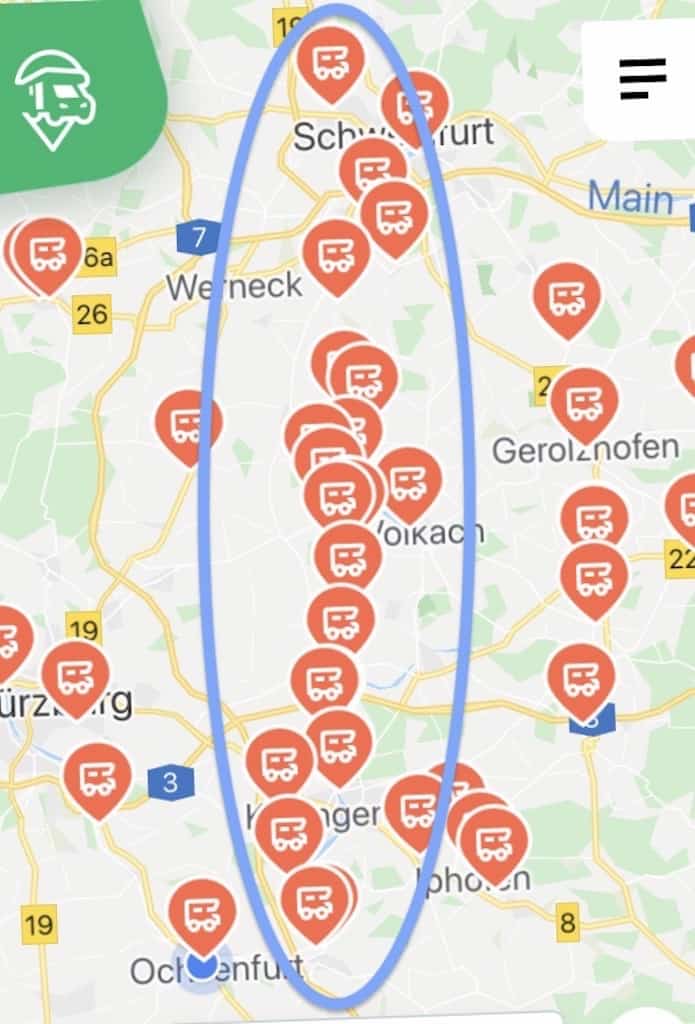 Auf der Strecke nach Schweinfurt gibt es am Main entlang jedoch jede Menge Stellplätze mit Servicestationen, wie die Karte zeigt. Eine davon, in Kitzingen, fahren wir an und versorgen uns. Die Gegend am Main scheint sehr beliebt zu sein, denn so vielen Reisemobilen wie hier, sind wir schon lange nicht begegnet.