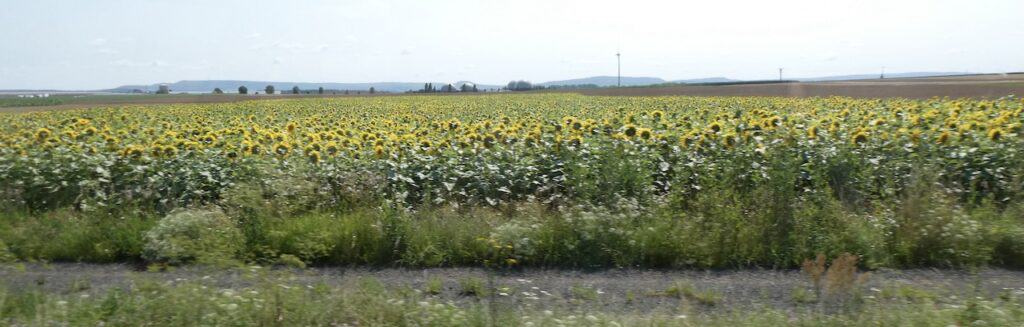 Nach dem gewohnten Bild mit Weinanbau sehen wir nun erstmals grosse Sonnenblumenfelder.