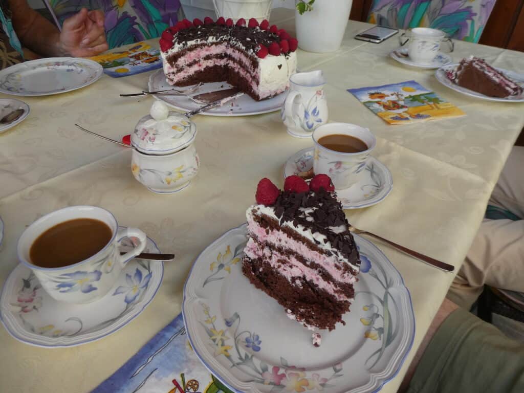 Bei Uli und Hans wartet eine riesige Torte auf uns, die Uli selbst gebacken hat. Lecker war sie auch. So aßen wir viel zu viel. Hans und Michael sind alte Jugendfreunde. Da gibt es viel zu erzählen und die Zeit vergeht wie im Flug.