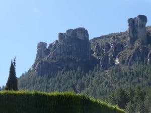 Hoch über uns sehen wir die Felsen, die Wahrzeichen des Nationalparks der Cevennen.