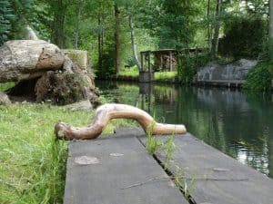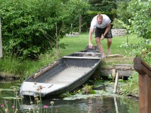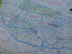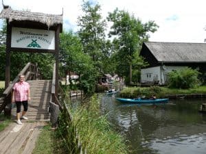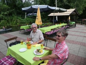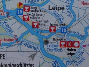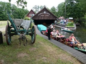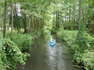 Immer wieder kreuzt man die Fließe, auf denen Spreewaldkähne voller Touristen gefahren werden und noch mehr Paddel- und Kanu-Mietboote. Oft kommen sich die beiden Gattungen in die Quere, denn so ein Fließ ist oft nur 2 Meter breit. Der Kahnfährmann hat immer Vorfahrt. Er bewegt den Kahn mit einem sogenannten Rudel durch das Wasser. Mit dieser langen Stange stösst er sich am Grund ab und lenkt gleichzeitig. Das verlangt Geschicklichkeit und Kraft.