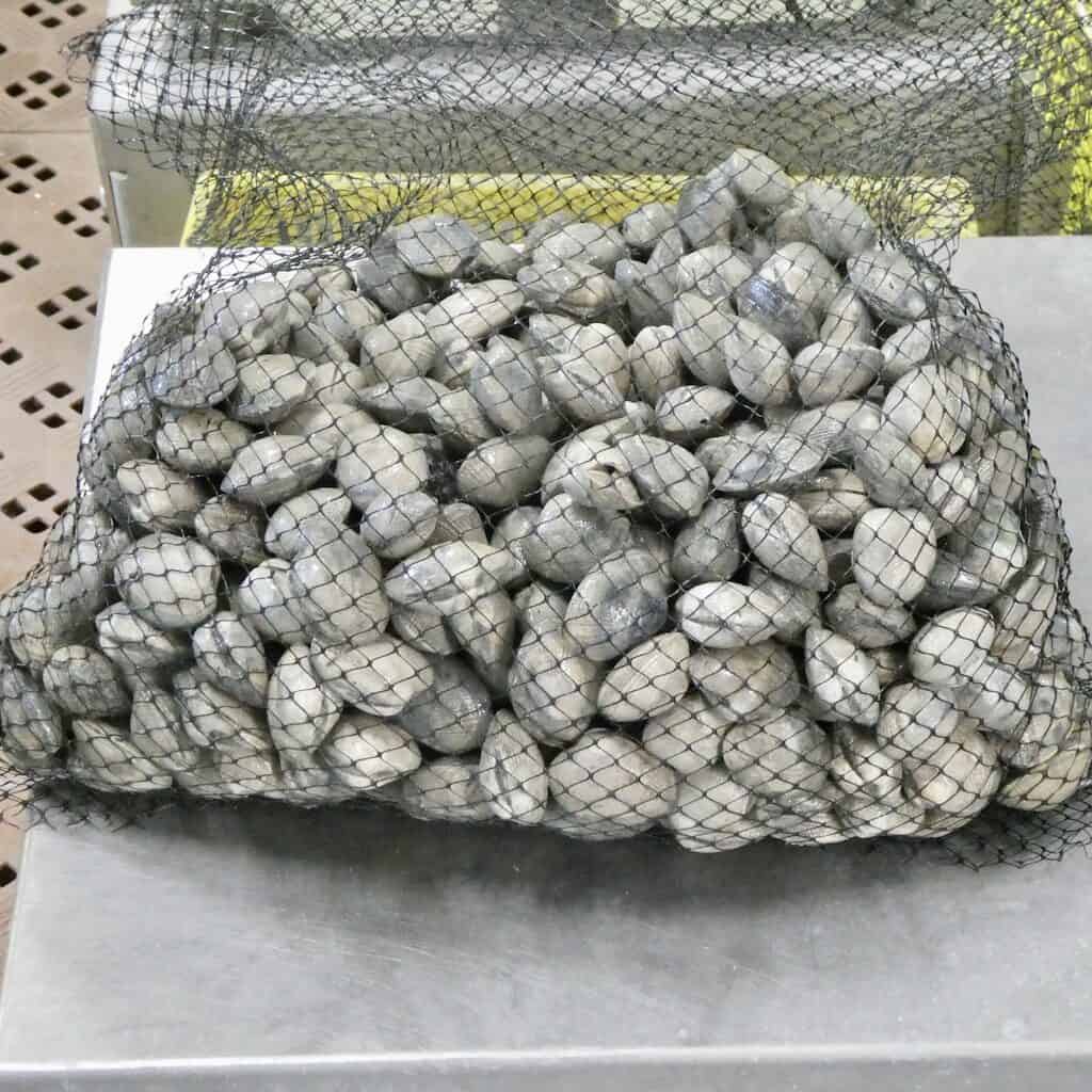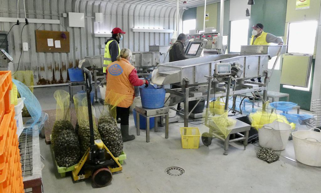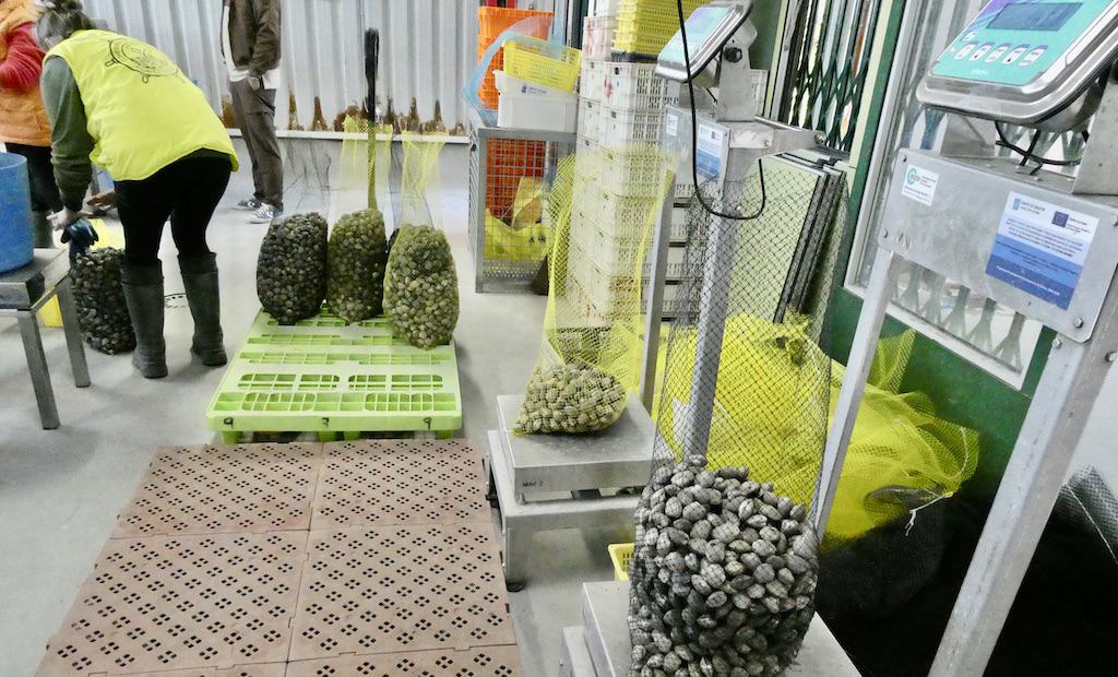 In der Sammelstelle hier beim Stellplatz werden die Muscheln maschinell nach Grössen sortiert und in Säcke abgefüllt und gewogen. Sie landen später hauptsächlich in Restaurants.