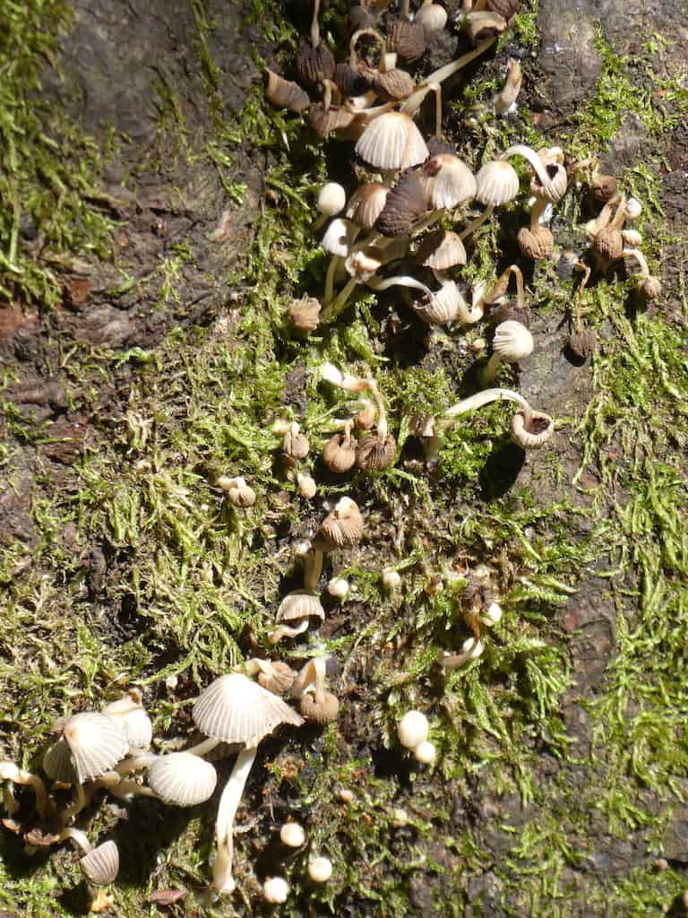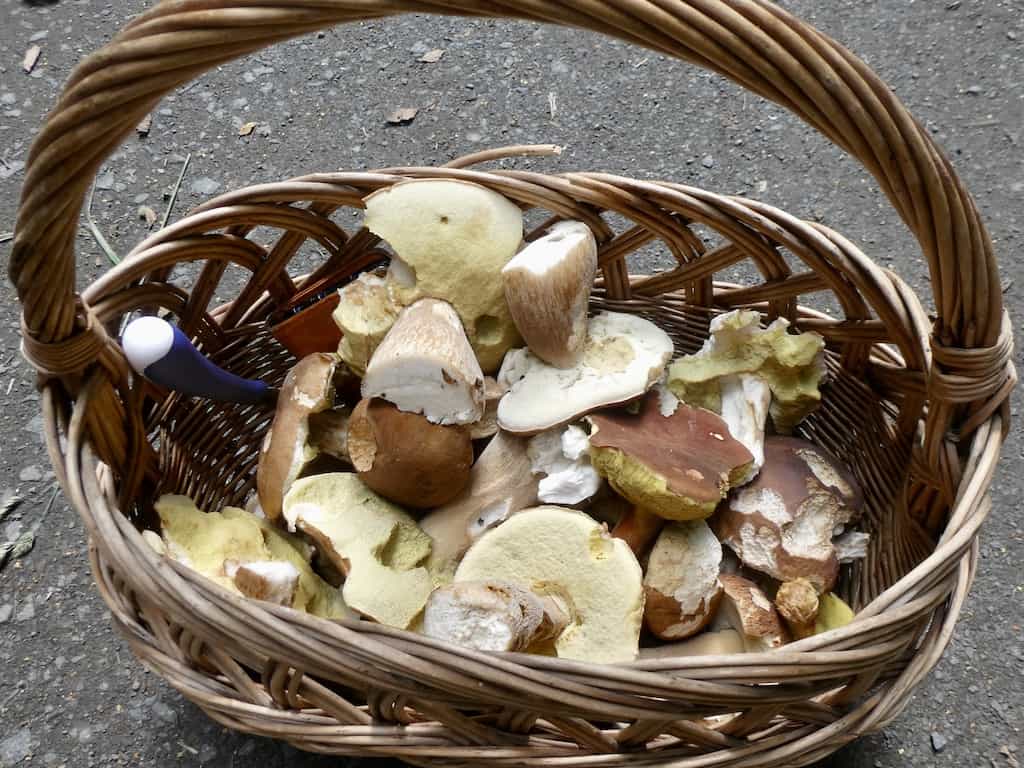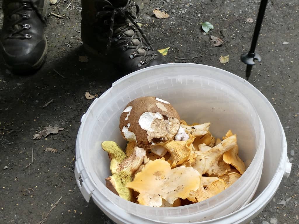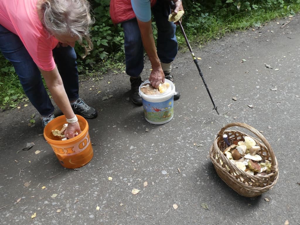 Wir begegnen drei Leuten, die reichlich Pilze gesammelt haben.