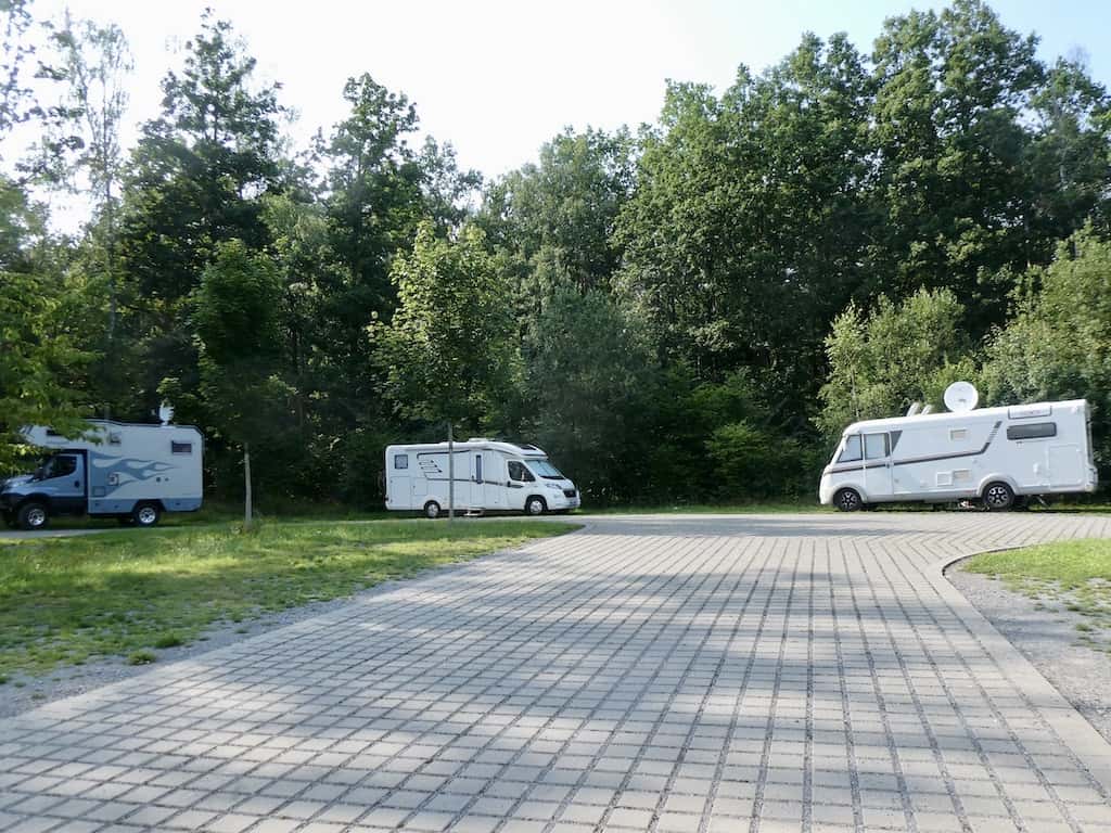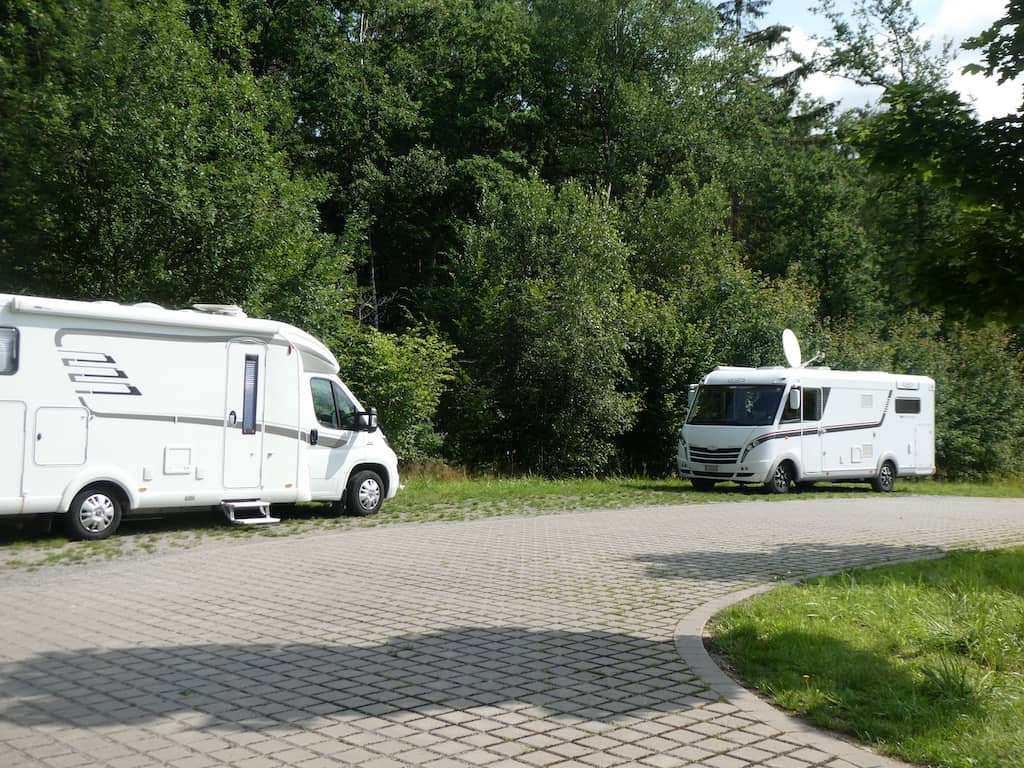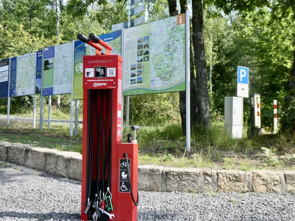 Wir fahren dazu von unserem ruhigen Übernachtungsplatz unterhalb auf den öffentlichen Parkplatz oberhalb des Sees. Das Telefonnetz ist hier zwar immer noch zu schwach für eine Internetverbindung. Aber wir haben freie Sicht nach Süden, können nun über unser Satelliten-WLAN den Blog ins Netz stellen. Für Radfahrer steht hier übrigens eine super Service-Station. Ein anderer Camper aus der Region Spessart steht auch schon hier.