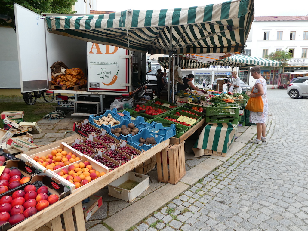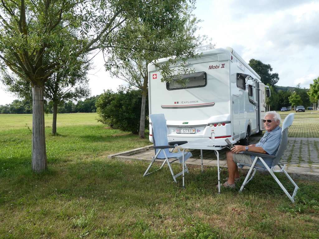 Unsere Parkzeit lässt es noch zu auf dem Marktplatz sogar ein leckeres Eis zu schlecken. Dann aber wollen wir weiterfahren zu unserem 50 Kilometer entfernten Ziel. Da meint ein Passant: «mit diesem Gefährt kommen Sie aber nicht durch’s Biertor zu dem Parkplatz, wo immer so viele Camper stehen».