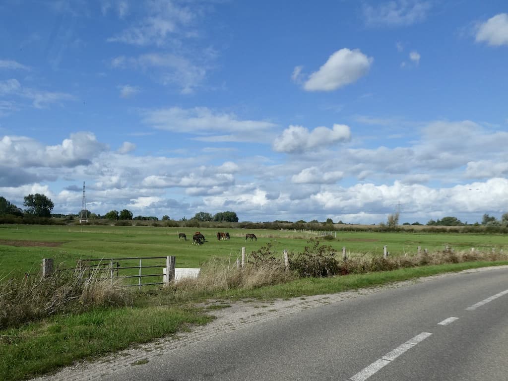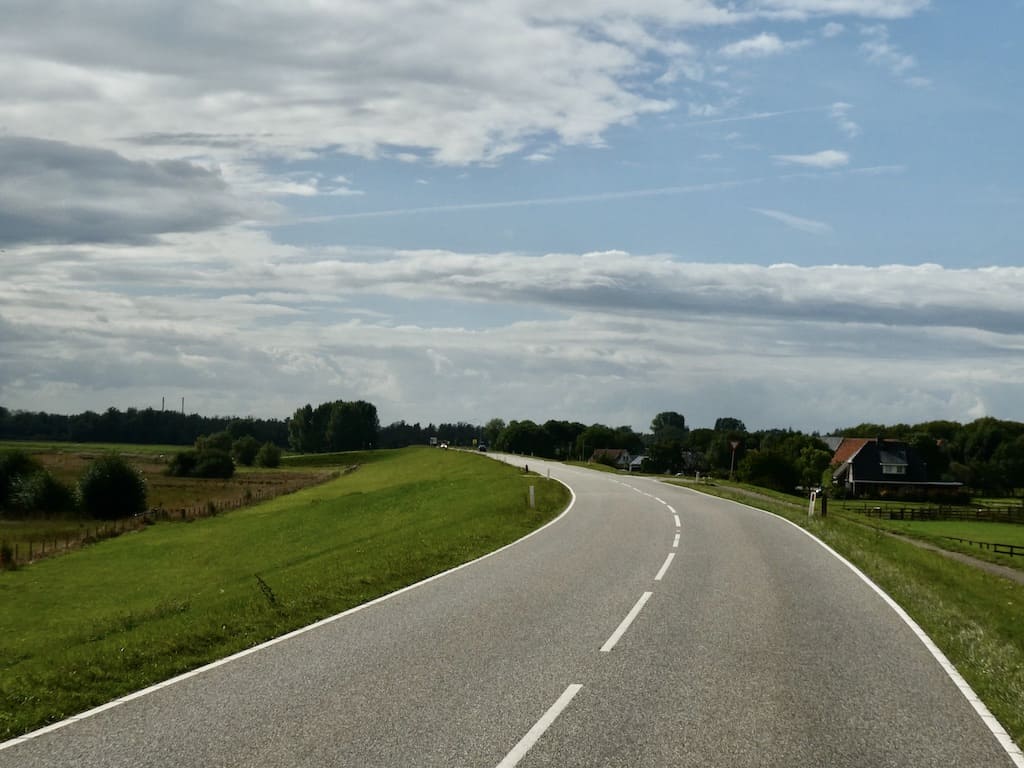 Am Niederrhein fahren wir auf recht schmalen Strassen auf hohen Deichen, die hier dem Hochwasserschutz dienen.