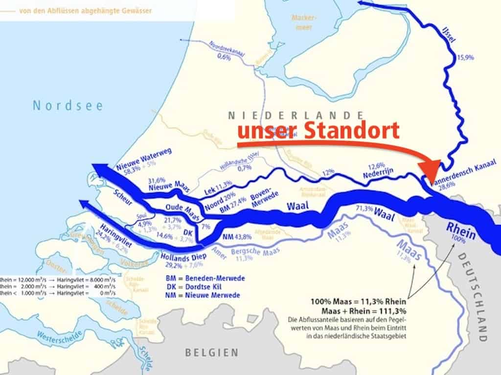 Der Rhein ist nämlich wenig oberhalb bei Millingen schon links abgebogen. Als Waal fliess er nach weiteren Verzweigungen westlich in die Nordsee. Während die IJssel nördlich fliesst, früher direkt in die Nordsee, heute in das IJsselmeer, das seit dem Bau (1927 bis 1932) eines 32 Kilometer langen Dammes von der Nordsee getrennt ist.