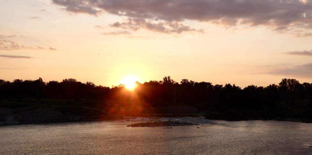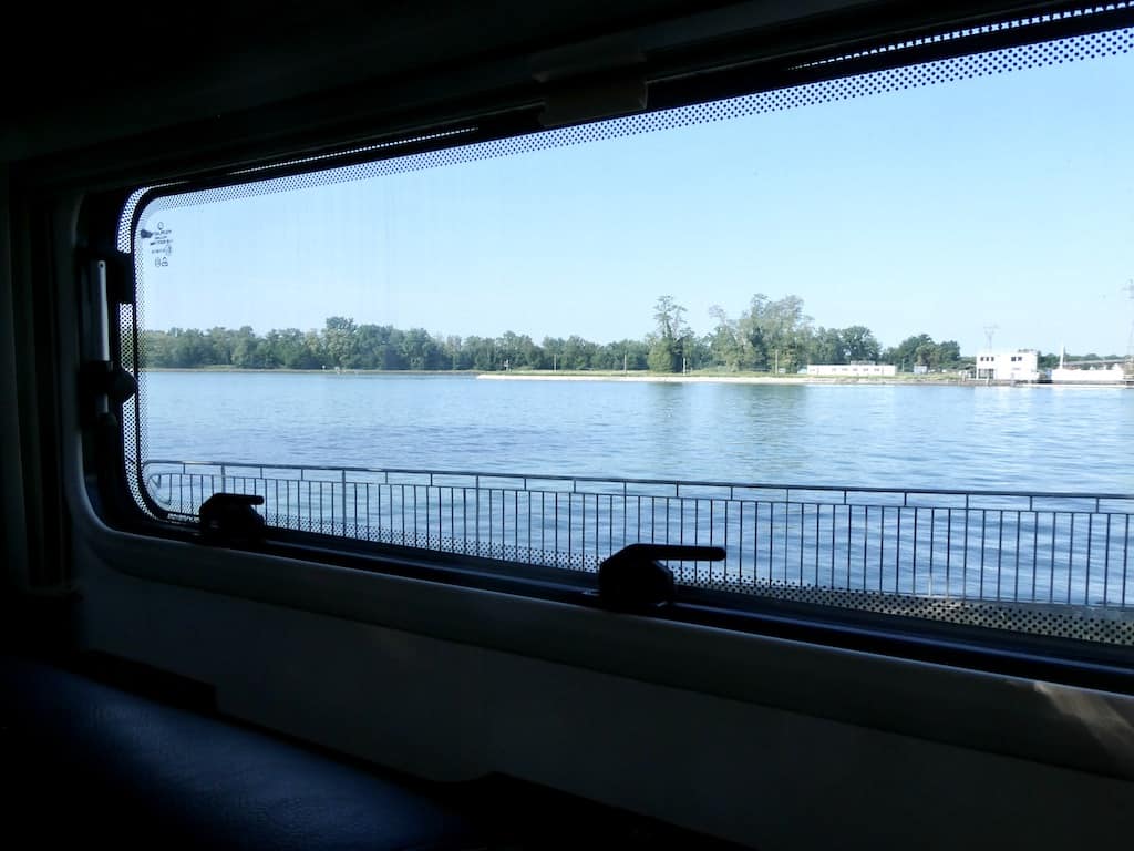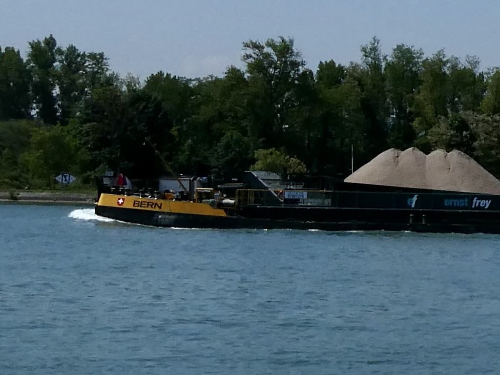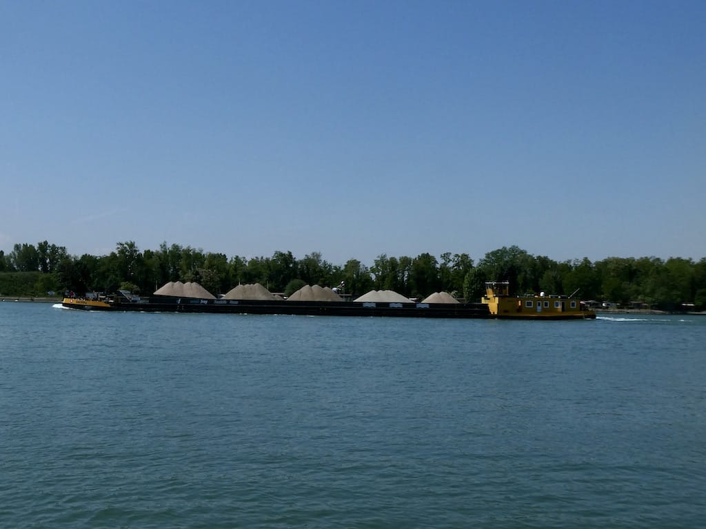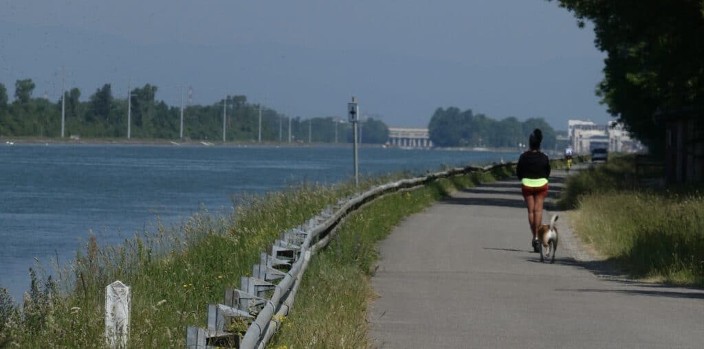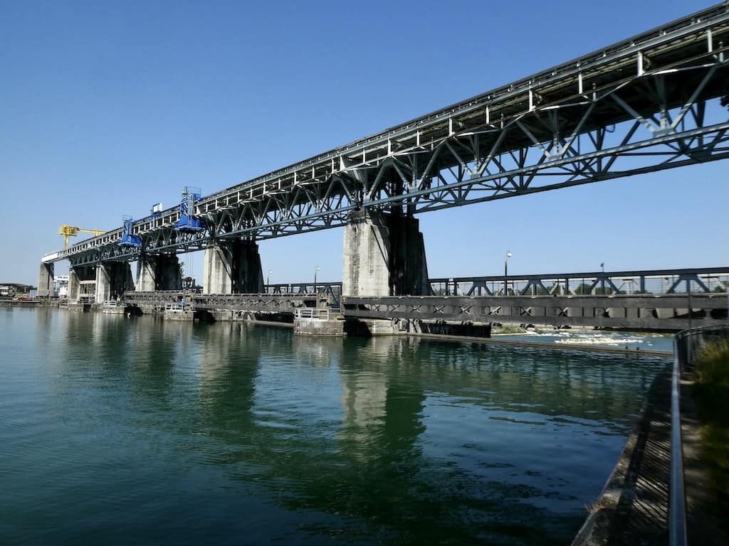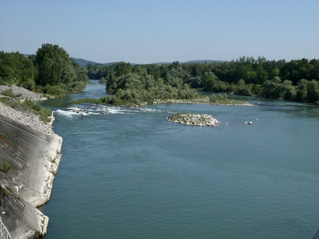 Hier kommen wir auch an den Kanal und sehen ganz in der Ferne die Schleuse Kembs.