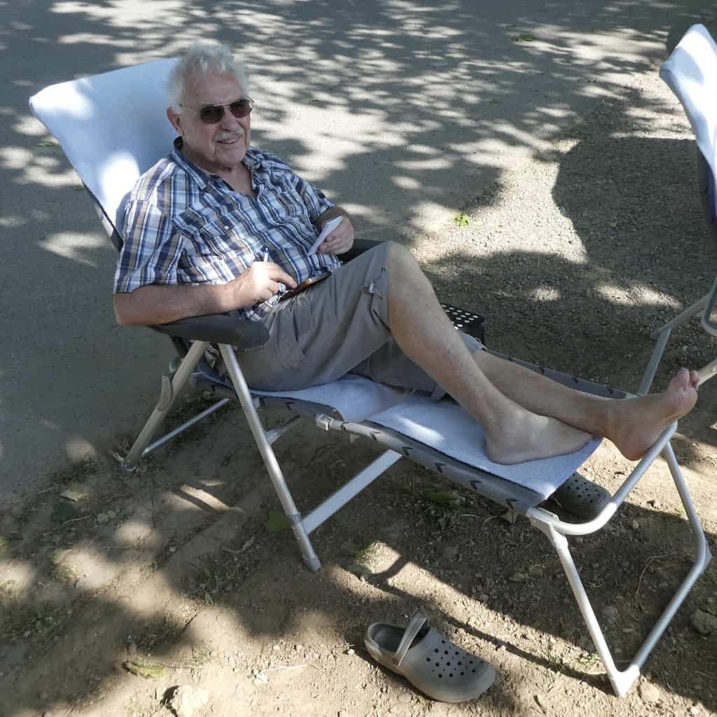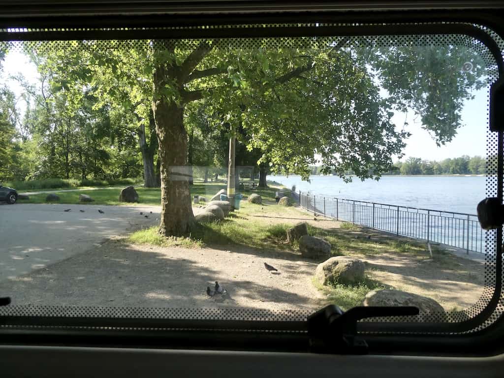 Wir haben die erste Nacht herrlich geschlafen. Das leichte Rauschen des Stauwehrs wirkt beruhigend. Die hohen Bäume sorgen bis zum Mittag für Schatten für unser Fahrzeug. Das ist ideal, damit wir uns erst einmal wieder an das Freiluft-Leben gewöhnen können. So sehen wir keinen Grund um weiterzuziehen.