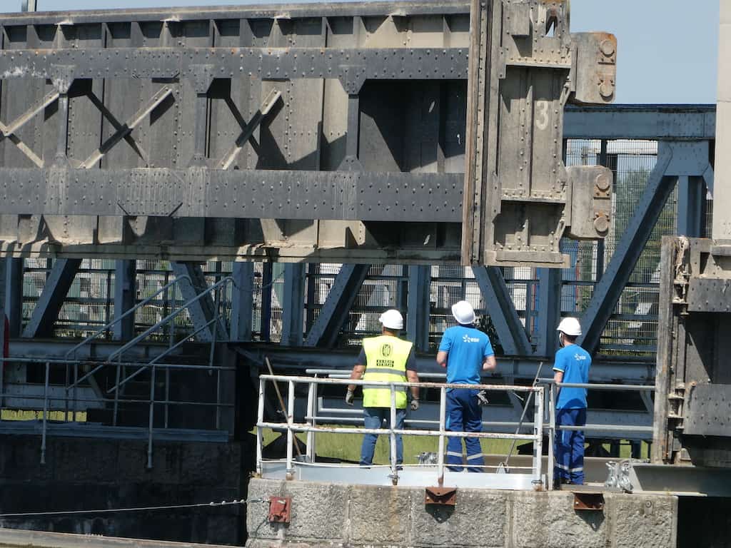 An so einer Wehranlage gibt es immer wieder Wartungsarbeiten zu erledigen. Man arbeitet mit einem riesigen Kran.