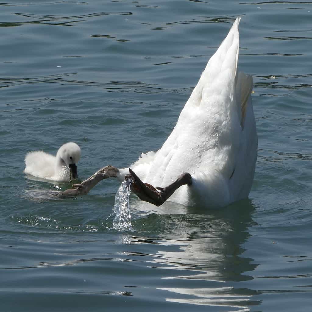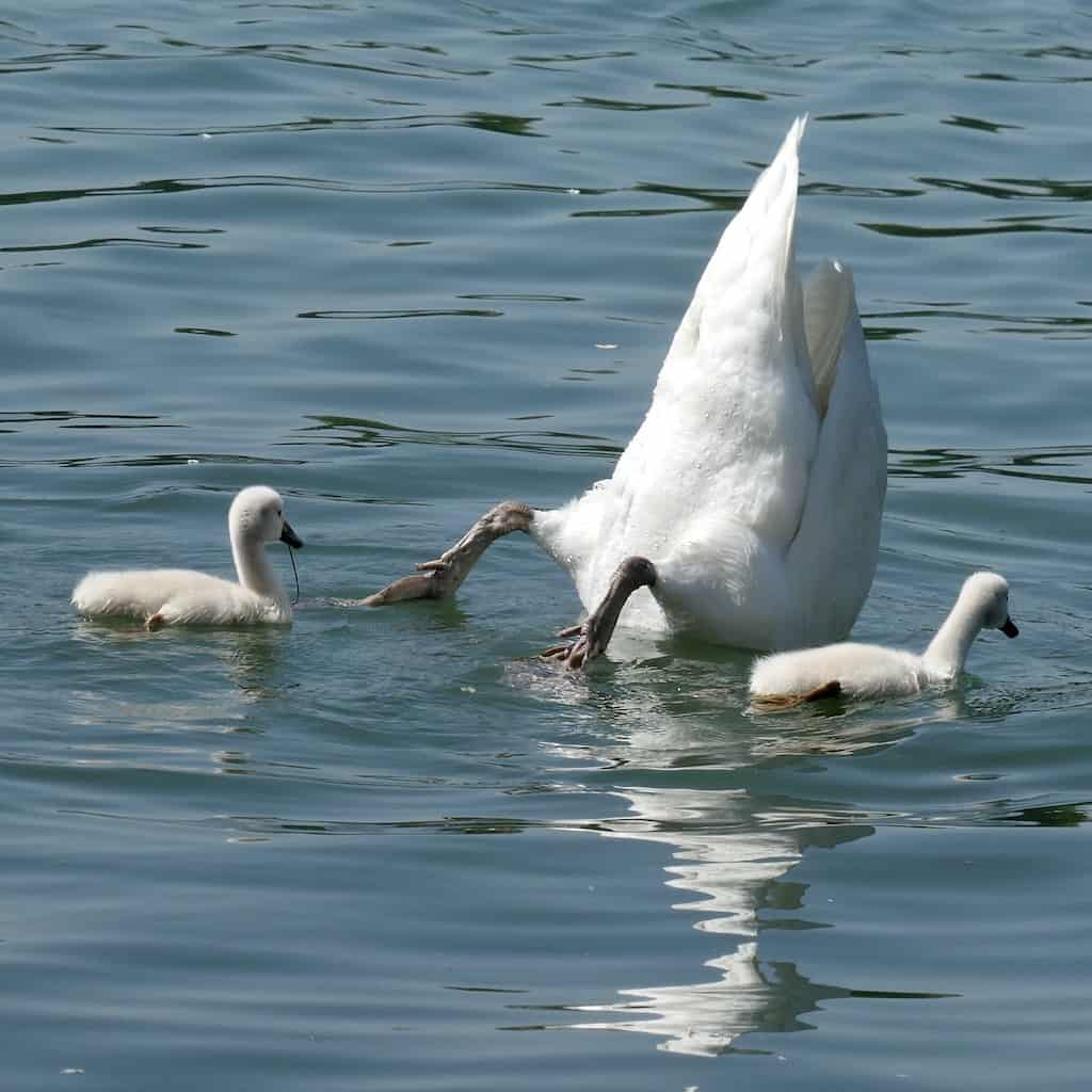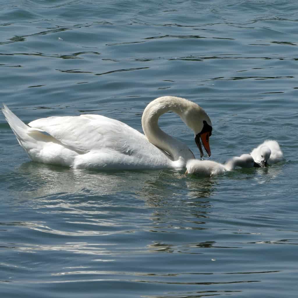 Nach unserem Ausflug nach Frankreich spazieren wir auf der deutschen Seite rheinaufwärts. Eine Schwanenmutter sorgt für Ihre Jungen.