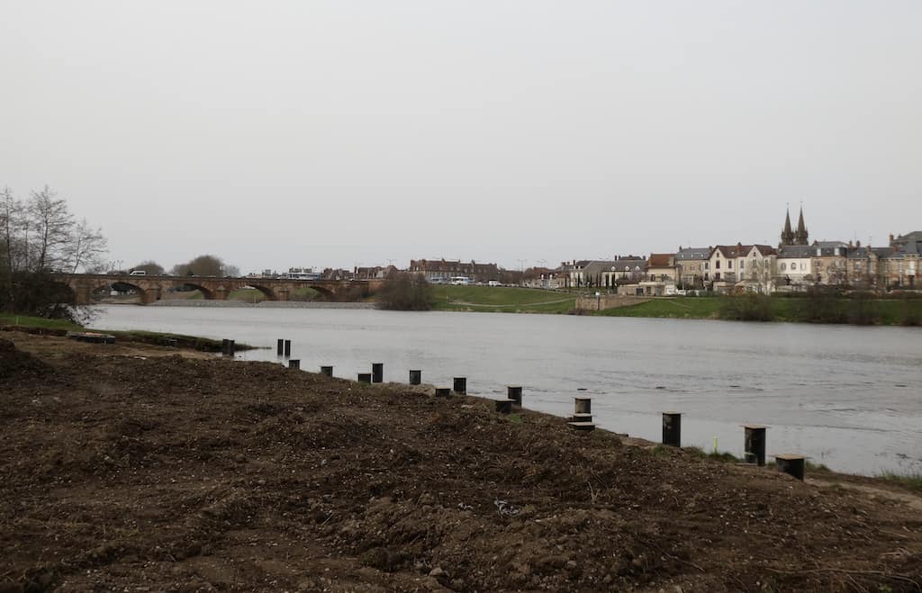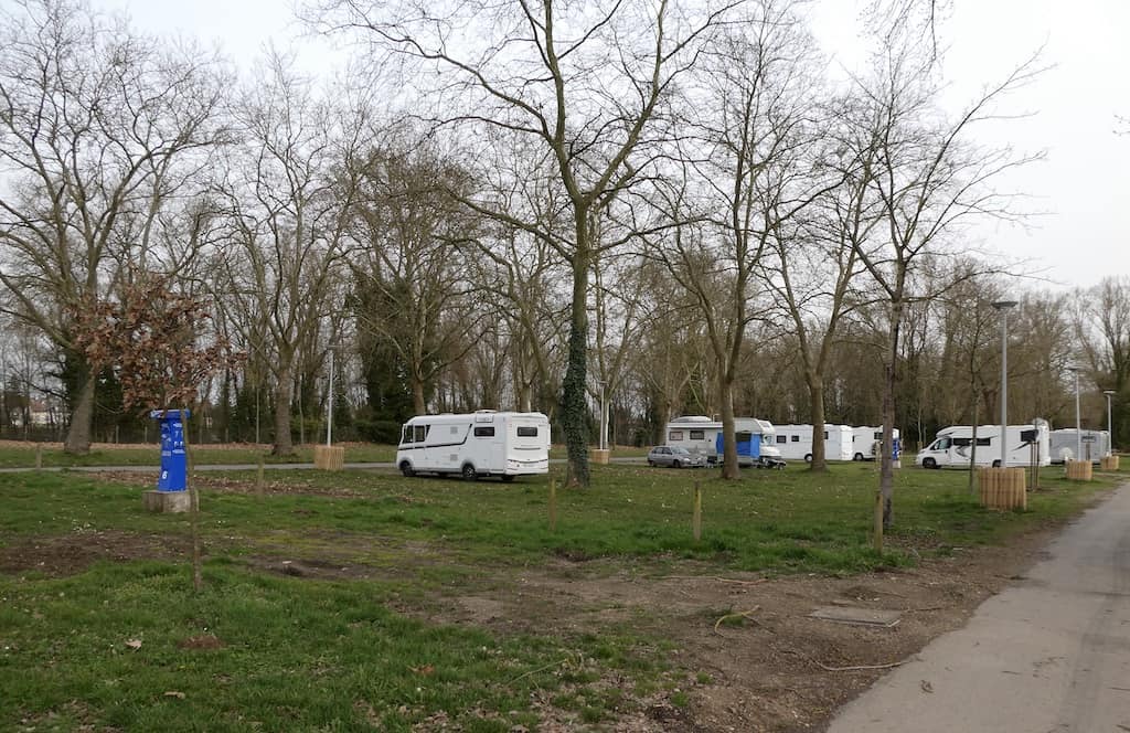 Ein grosser Stellplatz am Fluss, wobei die direkte Sicht durch Bäume versperrt ist. Es wird am Hochwasserschutz gebaut. Der Spazierweg am Ufer ist gesperrt.