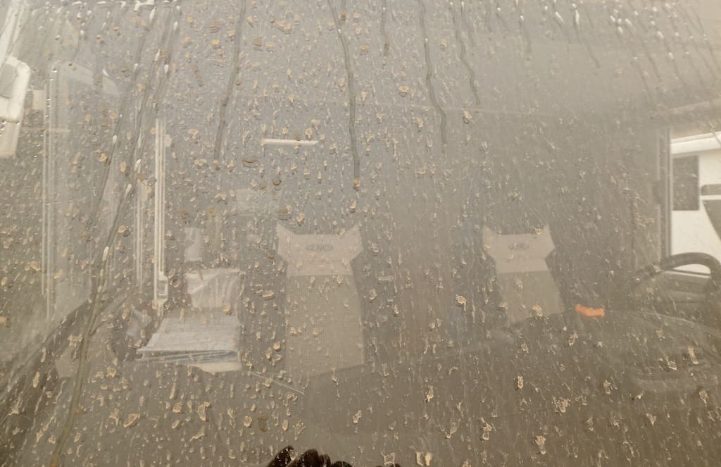 Da war zuerst einmal Scheiben reinigen angesagt. Eigentlich hätte es das komplette Fahrzeug nötig.