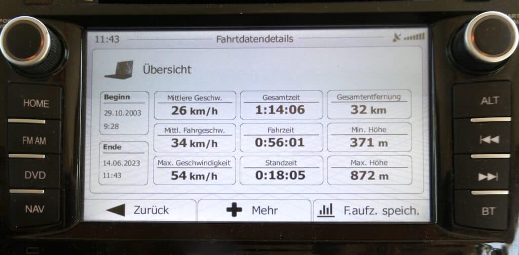 Die Fahrtendetails zeigen das langsame Vorankommen in diesem Gelände. Wobei wir es ja auch nicht eilig haben.