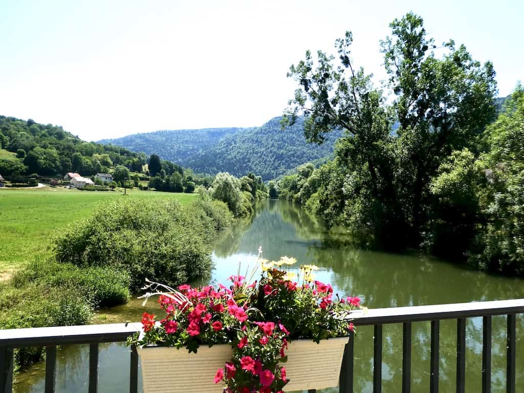 Schon nach wenigen Kurven bergan kommen wir an einen Aussichtpunkt mit einer tollen Sicht ins Tal des Doubs und auf den Grenzort Goumois und die gewaltigen Felsen gegenüber.