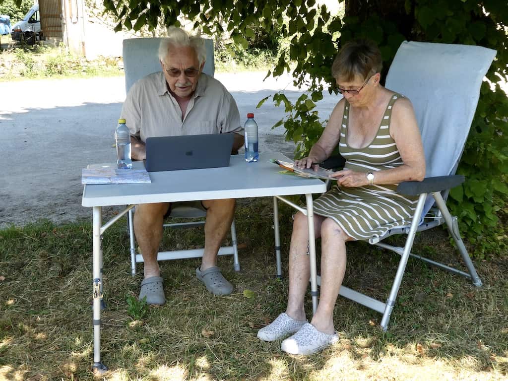 Wir geniessen den heutigen Tag weitgehend im Schatten. Solange es geht unter der grossen Linde und später iim Schatten des Mobis. Die Temperatur liegt heute bei 28 Grad im Schatten, ist aber durch den Wind sehr erträglich.