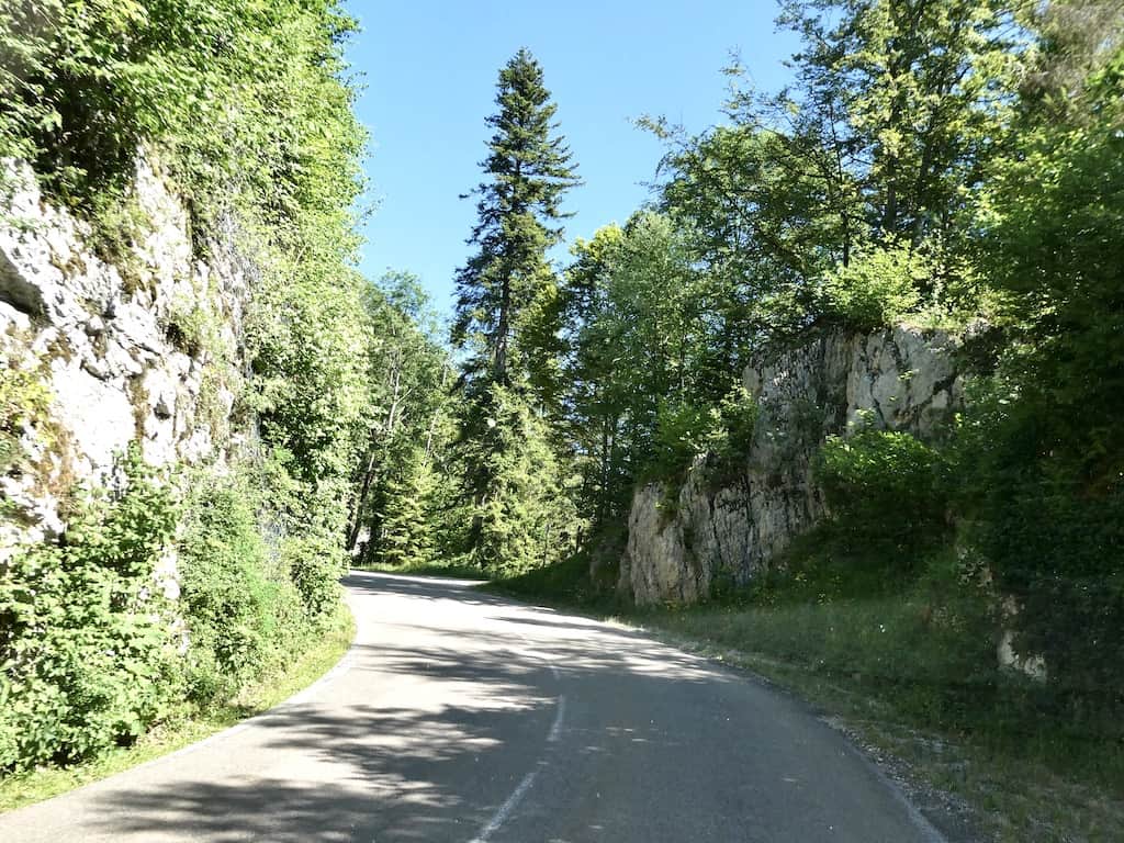 Heute fahren wir von unserem Übernachtungsplatz etwas oberhalb von Goumois am Doubs durch die «Corniche de Goumois» in den « Montagne du Jura » nach Vaufrey am Doubs. Der Doubs fliesst in Goumois noch in östlicher Richtung, später nach einer grossen Schleife dann nach Westen an Vaufrey vorbei.