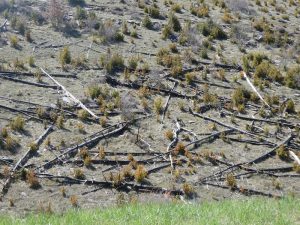 Immer wieder sehen wir Baumstämme an Hängen in der Landschaft liegen. Vielleicht ein Sturmschaden.
