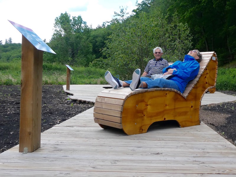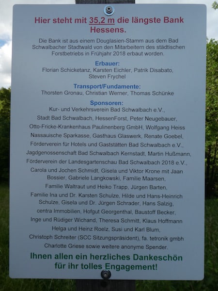 Dort steht auch die längste Bank Hessens. Die besteht aus einem 35 Meter langen Baumstamm einer Douglasie.