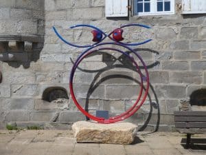 Bei einer Hausmauer sehen wir ein lustiges, modernes Kunstwerk