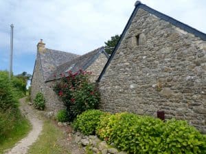 Die alten Steinhäuser haben Vorgärten mit vielen Blumen.