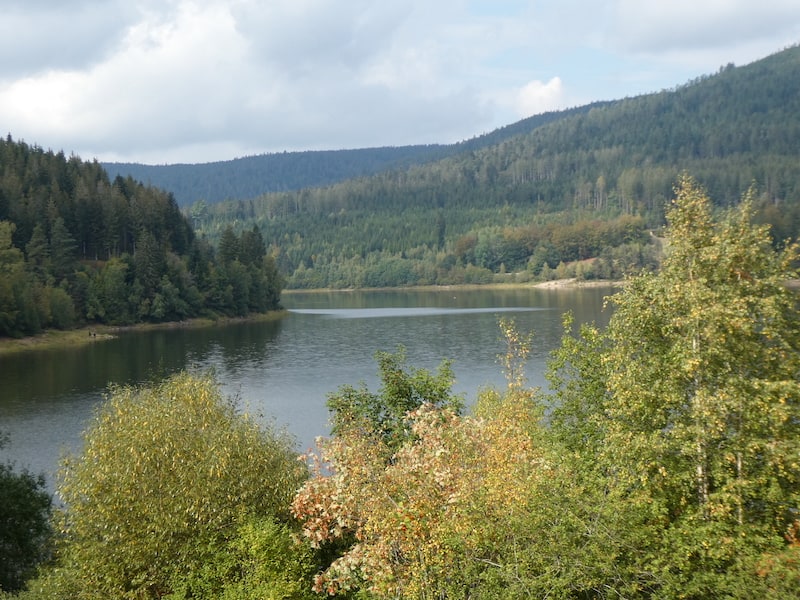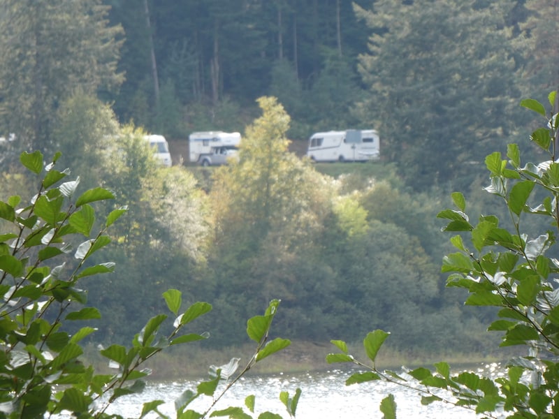 Auf einem grossen Parkplatz bei der Schwarzenbach-Talsperre finden wir einen guten Stellplatz. Wir stehen auch auf Anhieb waagerecht, was am Hang eher auf Glück als auf Können beruht. So müssen wir nicht auf Keile fahren.