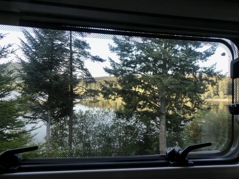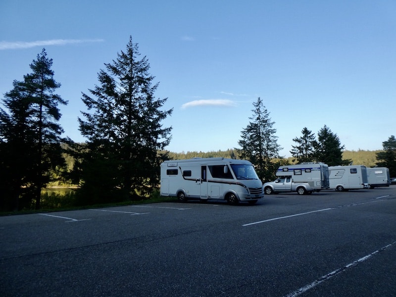 Schön stehen wir hier mit einigen anderen Campern. Gegen Abend geniessen wir von unserem «Wohnzimmer-Fenster» die Aussicht auf den See und das andere Ufer in der Abendsonne. Erfreulich ist auch, dass wir trotz der hohen Tannen Satellitenempfang haben und diesen Blogbeitrag über unser Satelliten-WLAN übermitteln können.