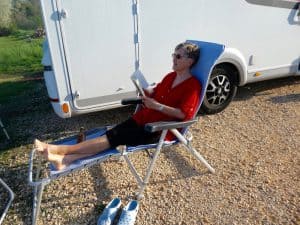 Am Abend kommt unsere Aussendusche zum Einsatz. Das ist von den Stellplatz-Verhältnissen nur sehr selten möglich. Praktisch ist das, so bleibt unser Innen-Duschraum trocken.
