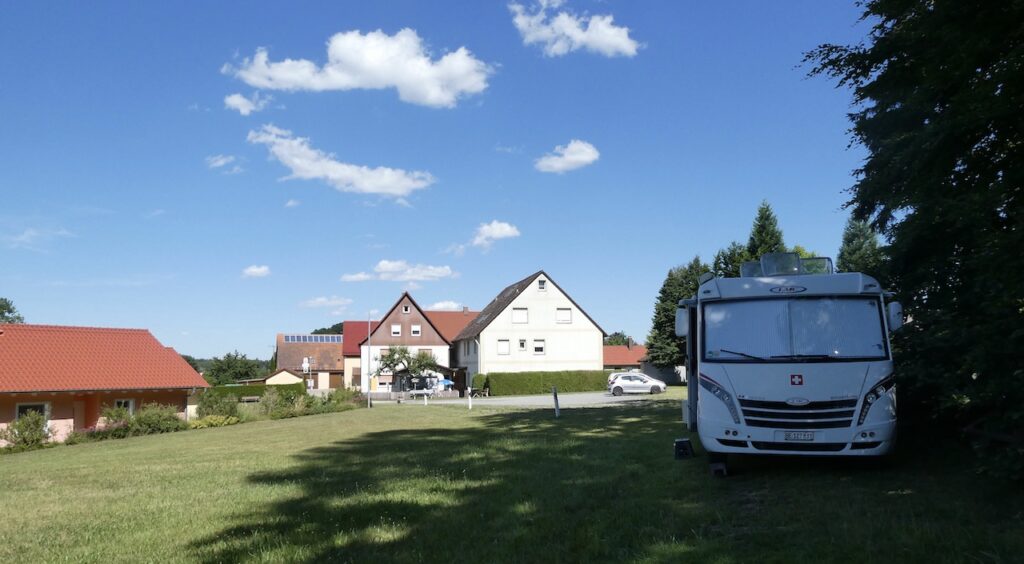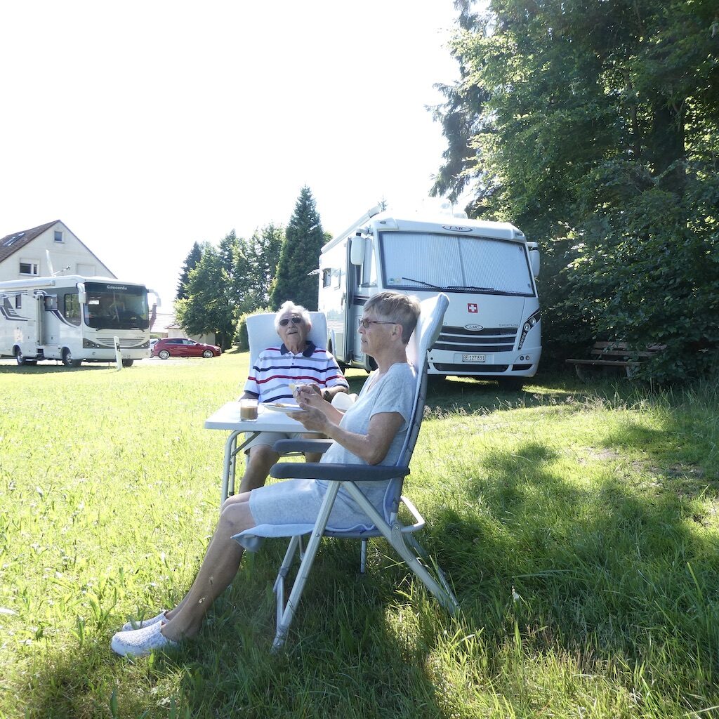 Nun haben wir auch das Glück, dass wir am Waldrand stehen können/dürfen und deshalb in der heissesten Zeit Schatten bekommen. Ausserdem kommt aus dem Wald immer ein kühlender Wind. Die anderen Stellplätze haben keinen Schatten. Die Entsorgung ist hier wohl möglich, aber umständlich. Der Wirt muss einen Schachtdeckel öffnen und man macht da lieber keine Umstände. Zumal bei uns noch kein fäkaler Notstand ausgebrochen ist.