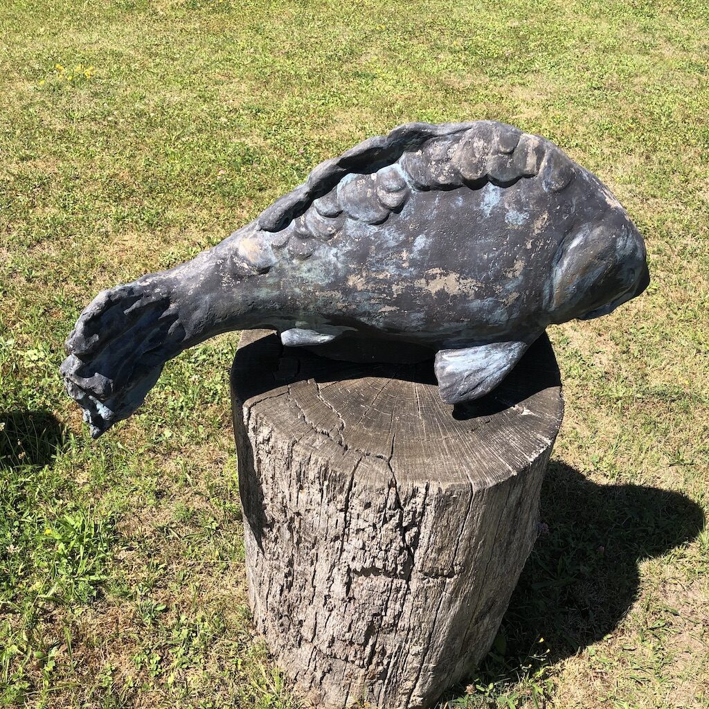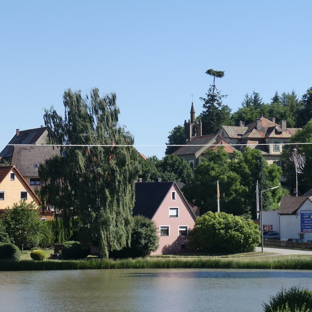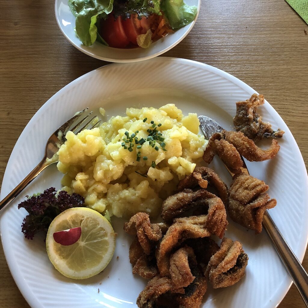 Bevor dieser Fisch hier in die Pfanne kommt, lebt er noch 14 Tage in klarem Wasser. So zubereitet ist dieser Fisch sehr lecker und unser Vorurteil gegen Karpfen wurde korrigiert. Für diese Spezialität wird vor dem Gasthof geworben.