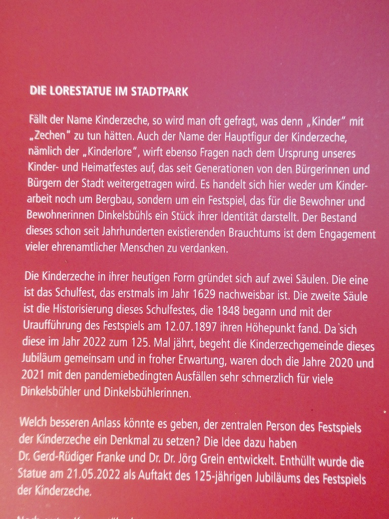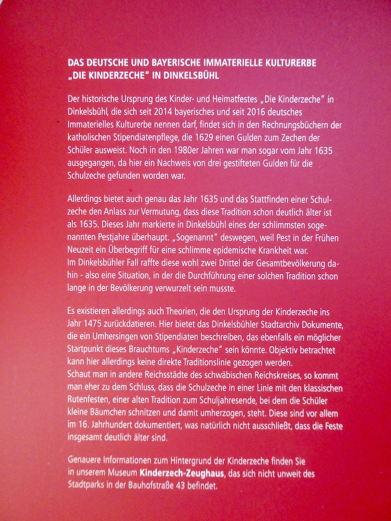 Die Gründung von Dinkelsbühl begann im 10. Jahrhundert mit dem Bau einer Befestigungsanlage mit Wall und Graben, letztere sind heute noch zu sehen. Im 30jährigen Krieg (1618-1648) wechseln in Dinkelsbühl achtmal katholisch-kaiserliche und evangelisch-schwedische Besatzer. Seit 1806 gehört die Stadt zu Bayern, heute mit rund 12’000 Einwohnern.