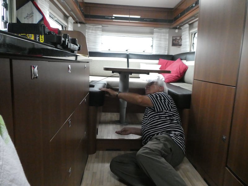 Dieses Problem werden wir wohl erst zuhause anständig lösen können. Trotzdem sind wir mit dem neuen Tischfuss zufrieden. Ja, und er lässt sich in der unteren Position auch gut fixieren.