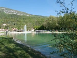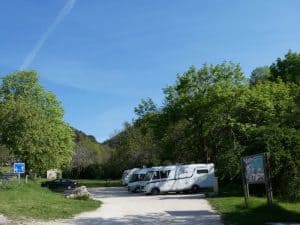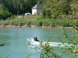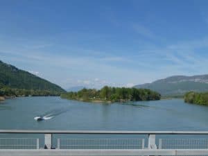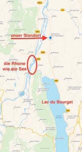 Unser heutiger Stellplatz in Serrières-en-Chautagne liegt bei einem kleinen Badesee. Heute, am Sonntag, herrscht hier reges Treiben. Der Platz ist gut besucht, aber gegen Abend fahren viele Camper noch nach Hause.