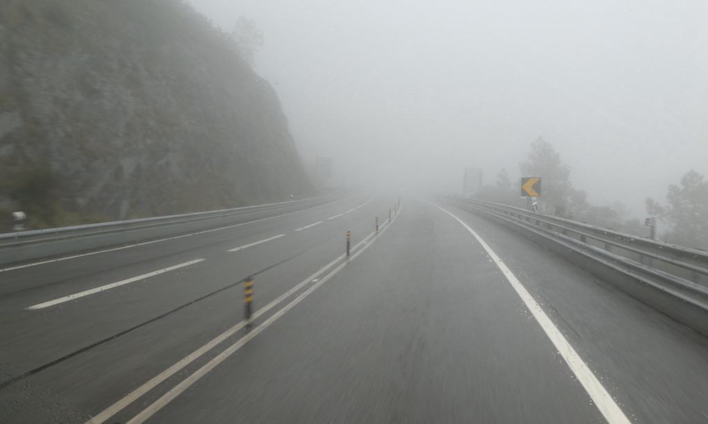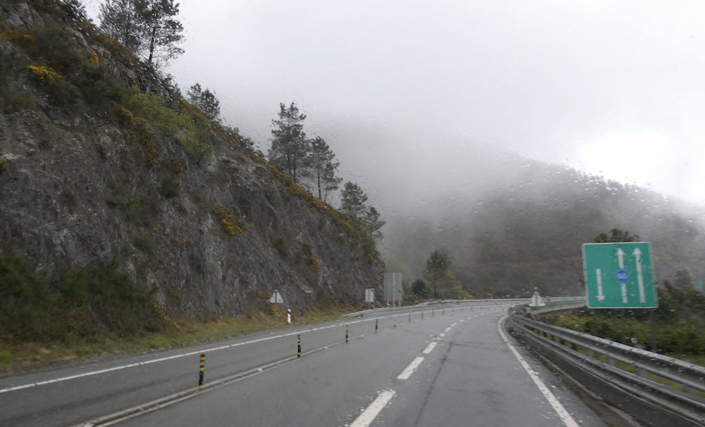Unsere Weiterfahrt führt zuerst in südliche Richtung sehr kurvenreich durch bergiges Gelände. Regen und Wolken lassen uns nicht viel von der Landschaft sehen.