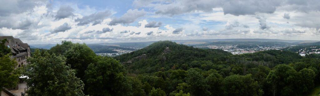 Von oben haben wir dann einen wunderschönen Ausblick auf Eisenach und die Landschaft.