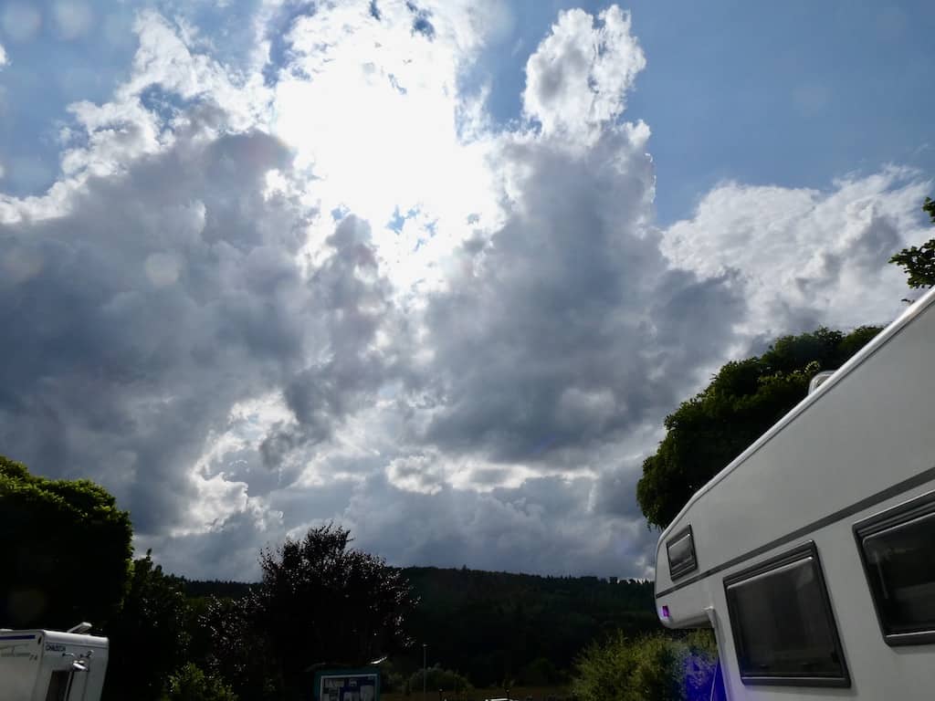 Wenn die Wolken die Sonne nicht verdecken, ist es enorm heiss. Unter der Markise staut sich dann die Hitze enorm. So verziehen wir uns hinter’s «Haus» in den Schatten, wo es dann auszuhalten ist. Aber 5 Minuten später folgt schon wieder ein Schauer. So geht dies einige Male.
